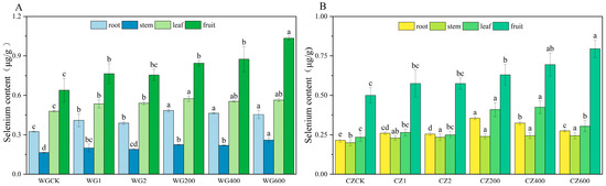 Selenium Content in Roots, Stems, Leaves, and Fruits of ‘Ponkan’ and ‘Bing Tang Cheng’. (A): Selenium content in roots, stems, leaves, and fruits of ‘Ponkan’; (B): selenium content in roots, stems, leaves, and fruits of ‘Bing Tang Cheng’. Lowercase letters indicate statistically significant differences among treatments at the p < 0.05 level.