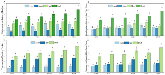 Organ-specific selenium BCF and inter-organ TF in ‘Ponkan’ and ‘Bing Tang Cheng’. (A): Selenium BCF in roots, stems, leaves, and fruits of ‘Ponkan’; (B): selenium BCF in roots, stems, leaves, and fruits of ‘Bing Tang Cheng’; (C): selenium TF in stems, leaves, and fruits of ‘Ponkan’; (D): selenium TF in stems, leaves, and fruits of ‘Bing Tang Cheng’. Lowercase letters indicate statistically significant differences among treatments at the p < 0.05 level.