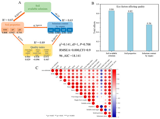 Relationships among soil properties, organ-specific selenium content, fruit quality indicators, and soil available selenium. (A) Structural equation model (SEM) illustrating the pathways linking soil available selenium, soil properties, selenium content in plant organs, and fruit quality indices. The model was constructed using the first principal component derived from principal component analysis (PCA) of soil properties, organ selenium levels, and quality parameters. Arrow width reflects the strength of the relationship; red and blue arrows denote significant positive and negative paths, respectively (* p < 0.05, *** p < 0.001). Numbers adjacent to arrows represent standardized path coefficients, and R2 indicates the proportion of variance explained. (B) Total effects of soil available selenium, soil properties, and organ selenium content on fruit quality. (C) Correlation heatmap depicting the relationships among soil available selenium, soil properties, selenium contents in various plant organs, and external and internal quality attributes. Pearson correlation analysis was performed to assess the associations between soil available selenium, soil properties, selenium contents in plant organs, and quality indicators. Correlation coefficients, ranging from negative to positive, are represented by a color gradient from blue to red. Parameter definitions in the figure are as follows: Root: selenium concentration in roots; Stem: selenium concentration in stems; Leaf: selenium concentration in leaves; Fruit: selenium concentration in fruits. Significance levels are denoted by asterisks (* p ≤ 0.05, ** p ≤ 0.01, *** p < 0.001).