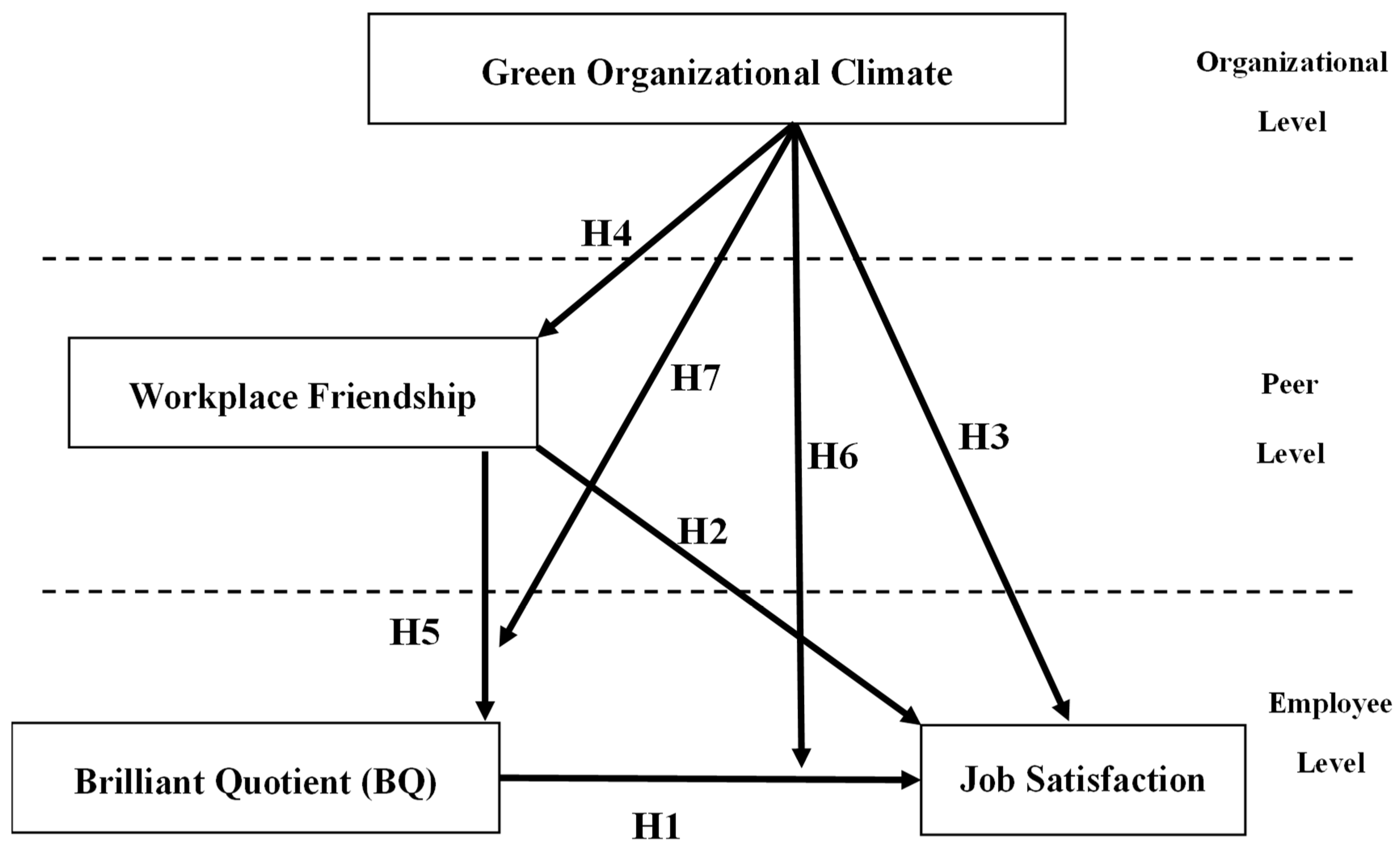 - Hypothesis 7 (H7): Green organizational climate in international tourist hotels moderates the relationships among workplace friendship, employee BQ, and job satisfaction.