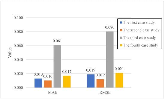 As with the training data, the test data results in Figure 3 show variations across the case studies. The first case study yields an MAE of approximately 0.021 and an RMSE of 0.023. The second case study exhibits an MAE of 0.037 and an RMSE of 0.039. The third case study, consistent with its training performance, shows the highest errors with an MAE of 0.060 and an RMSE of 0.087. The fourth case study presents an MAE of 0.033 and an RMSE of 0.035.