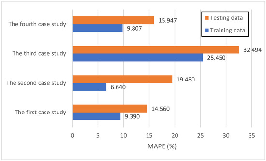 Figure 4 provides a comparative view of the MAPE for both training and testing data across the four case studies. MAPE is a convenient metric, as it presents the error as a percentage of the actual value, making it easily interpretable and comparable across different data scales. The paper also provides Table 5, which defines MAPE thresholds to categorize model performance (e.g., Excellent, Good, Acceptable/Reasonable, Poor).