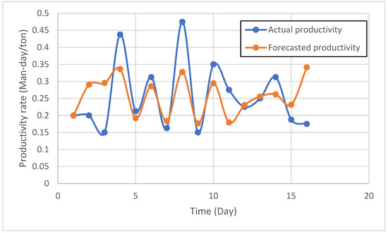 The LSTM layer is expertly designed to extract complex temporal patterns and dependencies embedded within the productivity trend. Long Short-Term Memory networks have demonstrated strong capability for learning such long-term dependencies in sequential data [19,39]. The network utilizes a 3-step lookback window to capture short-term, immediate temporal dependencies in the daily productivity data. This size was selected to offer sufficient recent context to detect high-frequency changes and short-cycle fluctuations without introducing excessive noise or relying on overly distant, potentially irrelevant data, following established best practices for time-series modeling [40]. The LSTM layer was configured with 24 hidden units. This moderate unit count, guided by general best practices for recurrent neural networks in time-series, ensures sufficient model capacity to learn the complex temporal dependencies while helping to prevent overfitting by avoiding the perfect memorization of training sequences, which is vital when working with limited training data. Sensitivity testing was performed on lookback window sizes of 2, 3, and 5. The corresponding MAPE values were 68.6%, 10.62%, and 11.09%, respectively, confirming that N = 3 provided the optimal balance between capturing recent context and reducing noise. Similarly, hidden unit counts of 12, 24, and 36 were evaluated, yielding MAPE values of 10.91%, 6.58%, and 9.24%, respectively. The configuration with 24 hidden units demonstrated the highest stability and best average performance on the validation set.