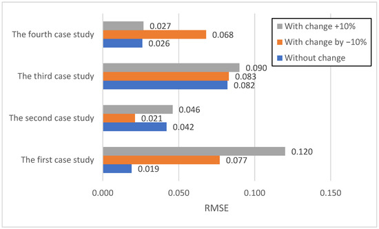 Figure 13 displays the RMSE values, which, by penalizing larger errors more heavily, corroborate the MAE findings. Baseline RMSE values mirrored MAE trends, with the first (0.019) and fourth (0.026) case studies showing lower errors, and the third (0.082) exhibiting the highest. A negative perturbation (−10%) led to increased RMSE for the first (0.077) and fourth (0.068) case studies, while the second (0.021) case again showed an improvement. A positive perturbation (+10%) resulted in the most significant increase in RMSE for the first case study (0.120), highlighting its vulnerability to larger prediction errors. The fourth case study consistently demonstrated robust performance with minimal changes in RMSE, reinforcing its stability.