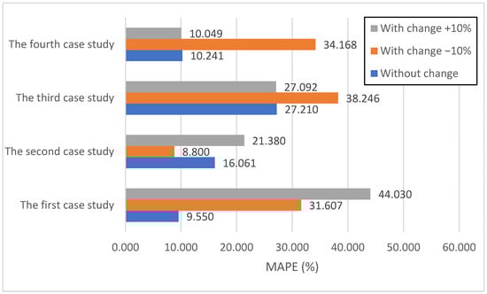 Figure 14 illustrates the MAPE, providing a relative measure of accuracy. Baseline MAPE values were lowest for the first (9.550%) and fourth (10.241%) case studies, with the third (27.210%) being the highest. Negative perturbation (−10%) drastically increased MAPE for the first (31.607%), third (38.246%), and fourth (34.168%) case studies, signifying a substantial loss of relative accuracy. The second case study, however, showed a notable decrease in MAPE (8.800%), further supporting the beneficial effect of negative perturbation. A positive perturbation (+10%) yielded the highest MAPE in the first case study (44.030%), highlighting the case study’s extreme sensitivity. The fourth case study maintained its relative accuracy with minor changes in MAPE, confirming its robustness.