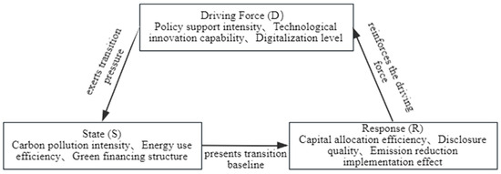 The Driving Force-State-Response (DFSR) model was proposed in 1996 by institutions such as the United Nations Commission on Sustainable Development (UNCSD) and the United Nations Department for Policy Coordination and Sustainable Development (DPCSD). Based on the Pressure-State-Response (PSR) model, it is a core indicator system for sustainable development, which expands environmental indicators to include economic and social indicators [22]. The essence of transition finance lies in leveraging financial instruments to proactively drive transformation and enhance transformative dynamics. In contrast to the passive responsive logic of the PSR model—where environmental “state” and social “response” are derived from the “pressure” exerted by human activities on the environment—the DFSR model reflects the proactive driving logic of transition finance more accurately and comprehensively. By incorporating core “driving force”, namely policies, markets, and technologies, as priorities within its indicator system, the model achieves a high degree of conceptual consistency between its framework and the research subject. This study upholds the principles of scientific systematicness, industrial applicability, and data verifiability. By closely integrating the specific context and core connotation of the power sector’s low-carbon transition, it pioneers the introduction and reconstruction of the DFSR model from the field of environmental management into transition finance evaluation. A 15-indicator evaluation system for the transition finance of power sector is constructed, covering three dimensions: Driving Force (D), State (S), and Response (R). The theoretical framework of this system is presented in Figure 1. This model innovatively articulates the inherent dynamic mechanism of transition finance: “external resource drivers→corporate environmental performance→corporate response actions.” It links the national macro “dual carbon” orientation with actionable, quantifiable micro-level corporate indicators, bridging the gap between macro policy goals and micro implementation metrics.