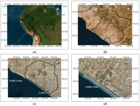 Location of the study area and sampling wells in the hyper-arid La Yarada Los Palos coastal agroecosystem, Caplina Basin, southern Peru. (a) Peru within South America. (b) Tacna region and the coastal sector of the Caplina Basin. (c) La Yarada Los Palos district on the Pacific coast, showing the irrigated area and the three monitored irrigation wells. (d) Close-up of the monitored wells (Points 1–3), which correspond to the Southern Border, Bio Garden Los Palos, and Ashlands settings described in the text.