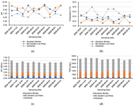 In situ field parameters measured at the three monitored irrigation wells in La Yarada Los Palos from October 2024 to July 2025: (a) pH, (b) temperature (°C), (c) electrical conductivity, EC (dS/m), and (d) total dissolved solids, TDS (mg/L). The three wells correspond to Southern Border, Bio Garden Los Palos, and Ashlands.