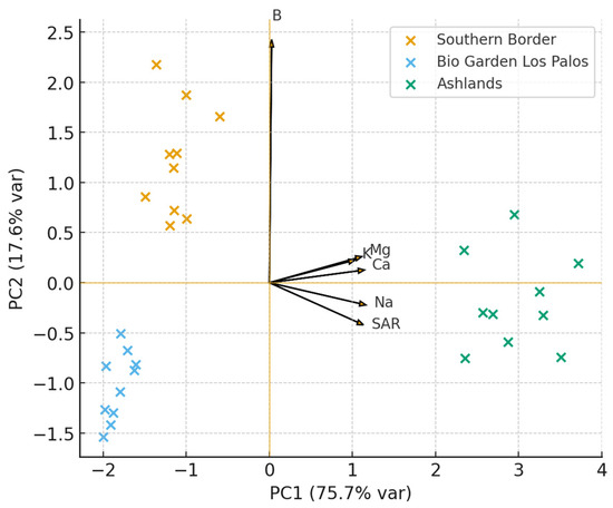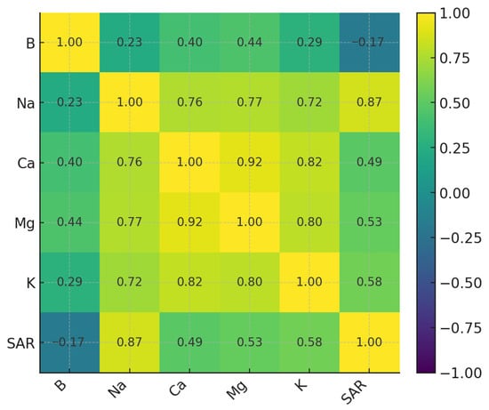 We computed descriptive statistics and Spearman’s rank correlations (ρ) among boron, major cations, EC, and TDS, followed by PCA to identify dominant gradients [66]. We then applied principal component analysis (PCA) to reduce dimensionality and identify dominant drivers—chiefly salinity and broader water quality gradients—that explain the most variance, a standard approach used for coastal aquifers [67]. Finally, we visualized the distributions of SAR and %Na to delineate higher-risk conditions and support water management decisions; no spatial interpolation was performed given the low density of sampling points (n = 3) [32].