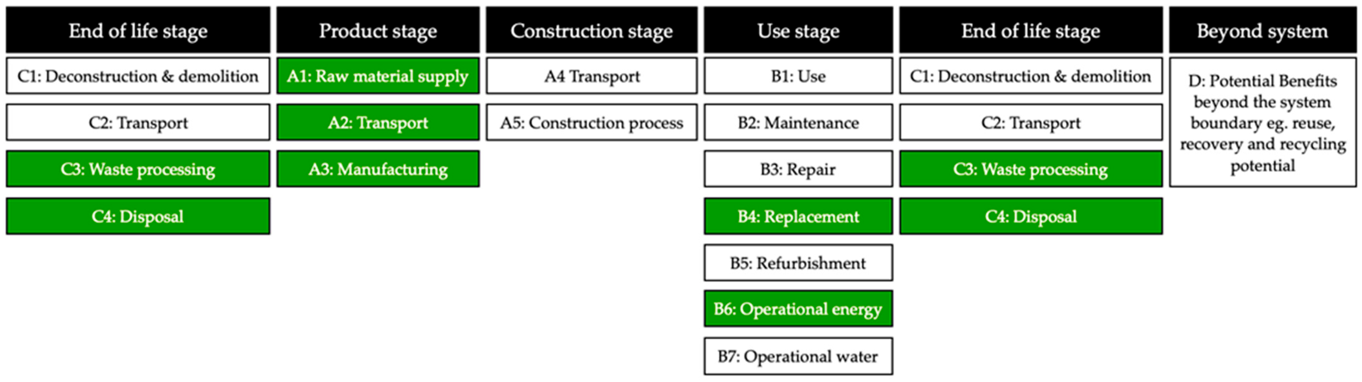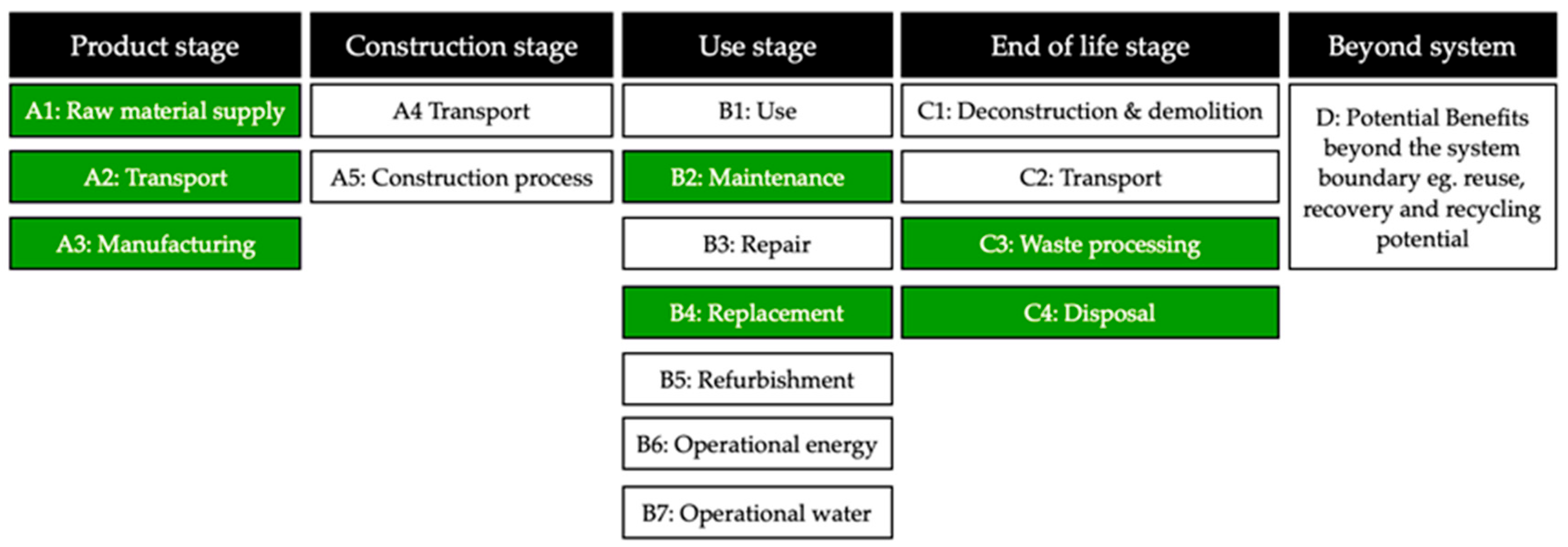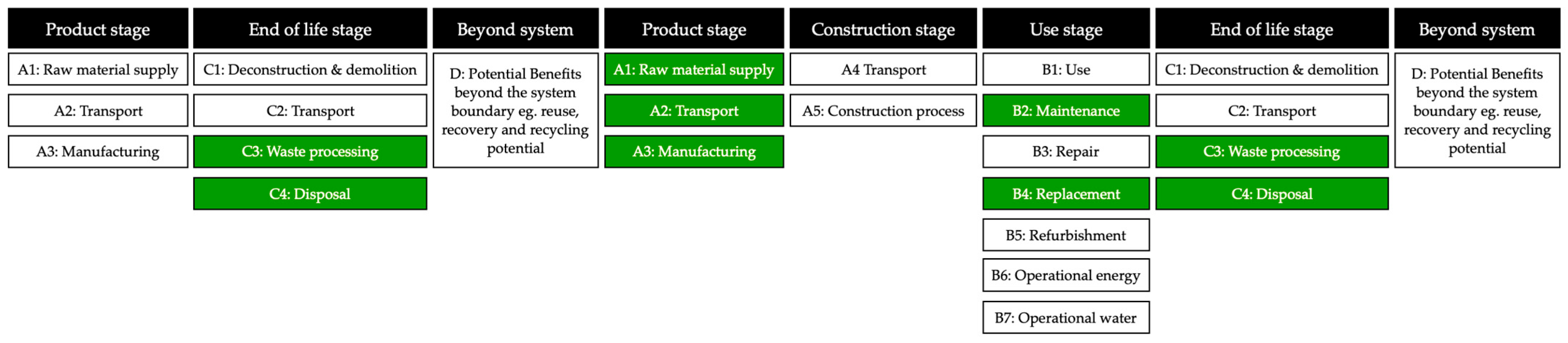 73]. To limit the uncertainty resulting from data quality, this study utilised generic EPD data and kept the selected dataset constant across scenarios. This methodological choice means that changes in GWP between scenarios are due to the actual change described in the scenarios, rather than to changes in the assigned EPD. The choice of using generic EPDs aligns with the LCA method presented in BR18 [