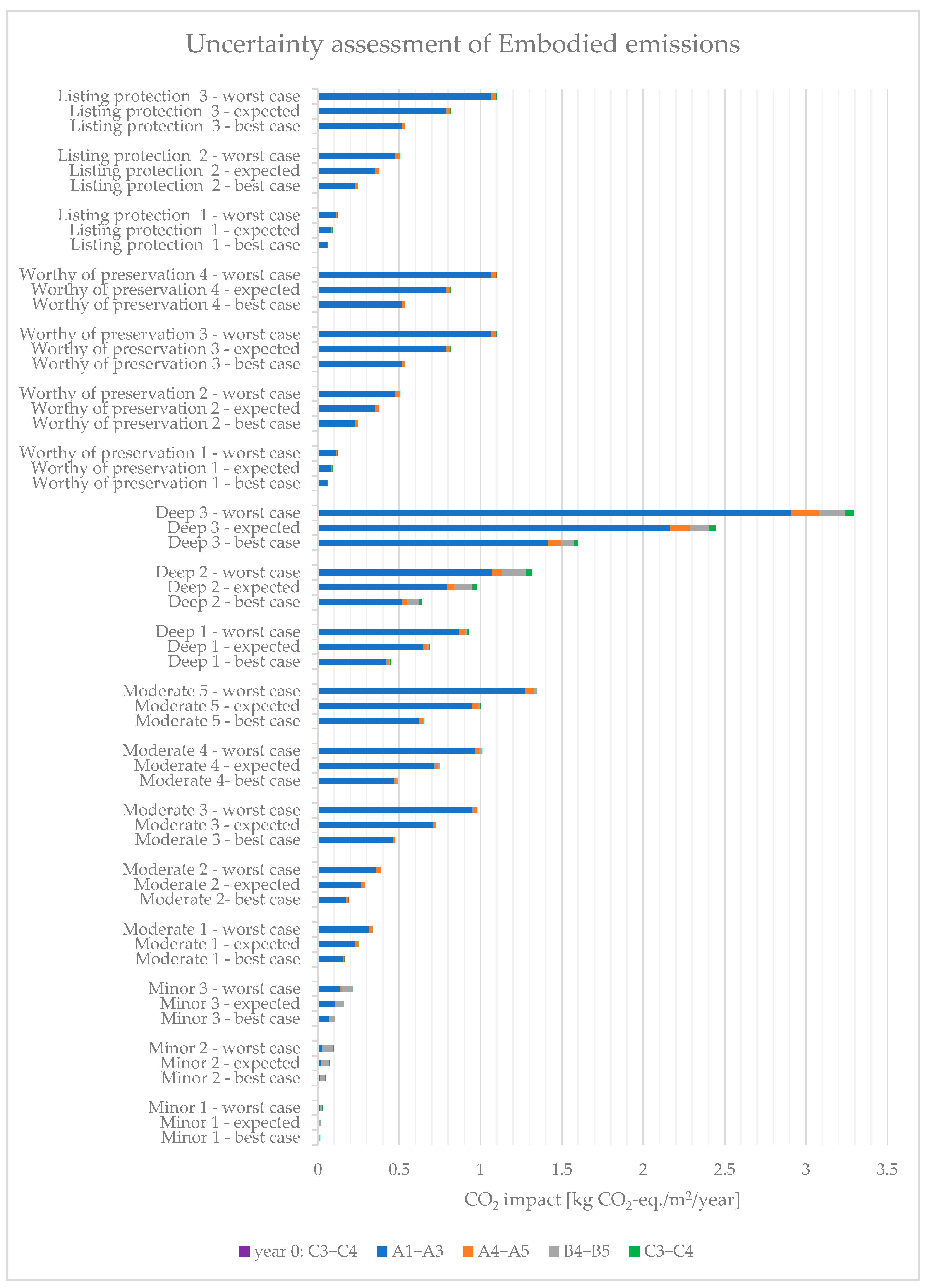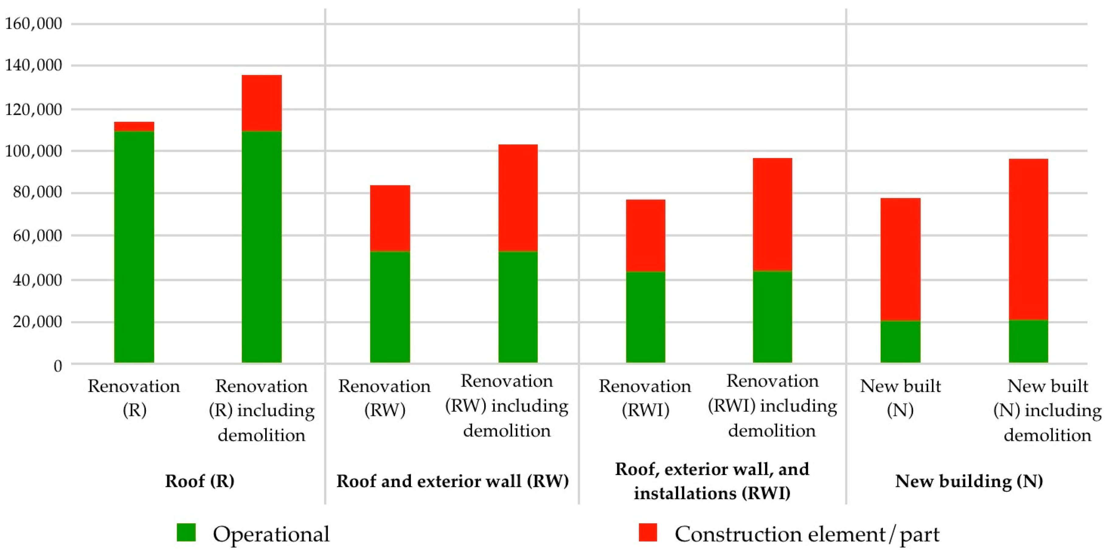 56]. On the contrary, the scope of the LCA for the renovation cases includes only the embodied carbon from the building parts that are replaced or added during the renovation, as well as the continuous maintenance of these parts, and the energy use for moderate, deep, worthy of preservation, and listed protected scenarios.