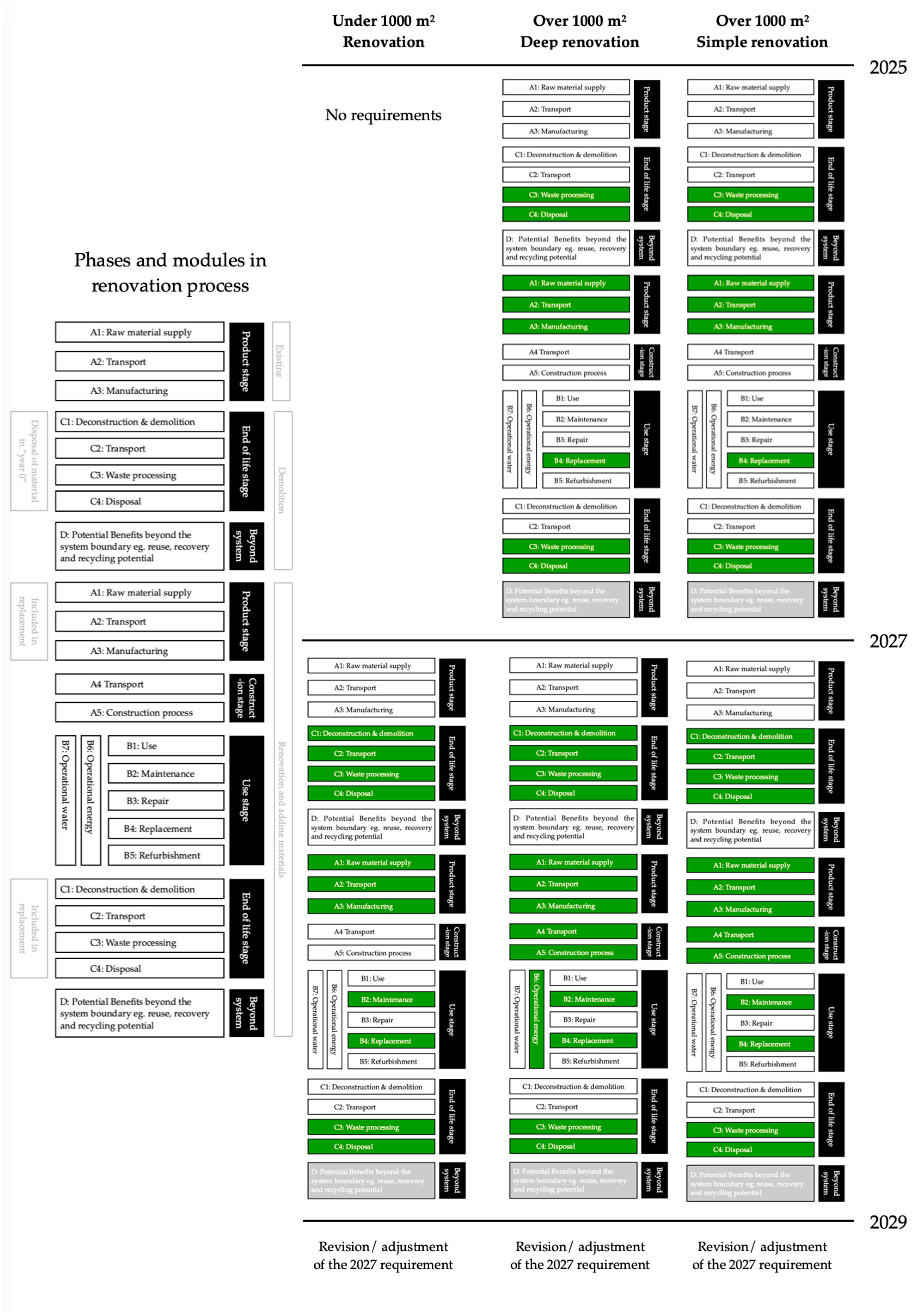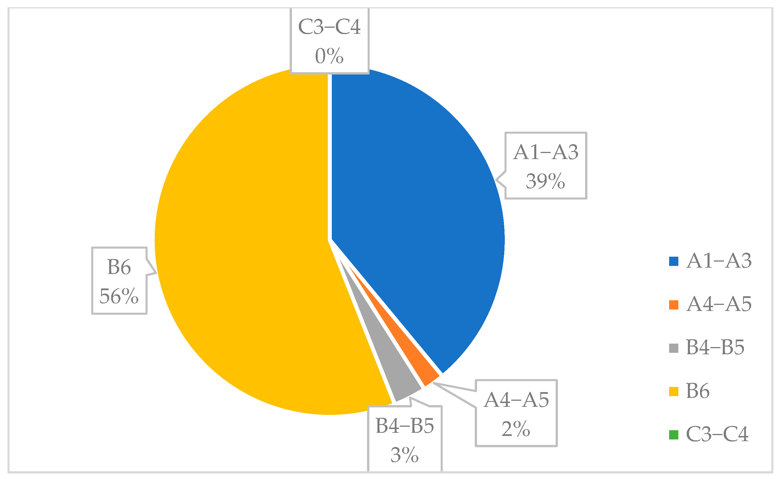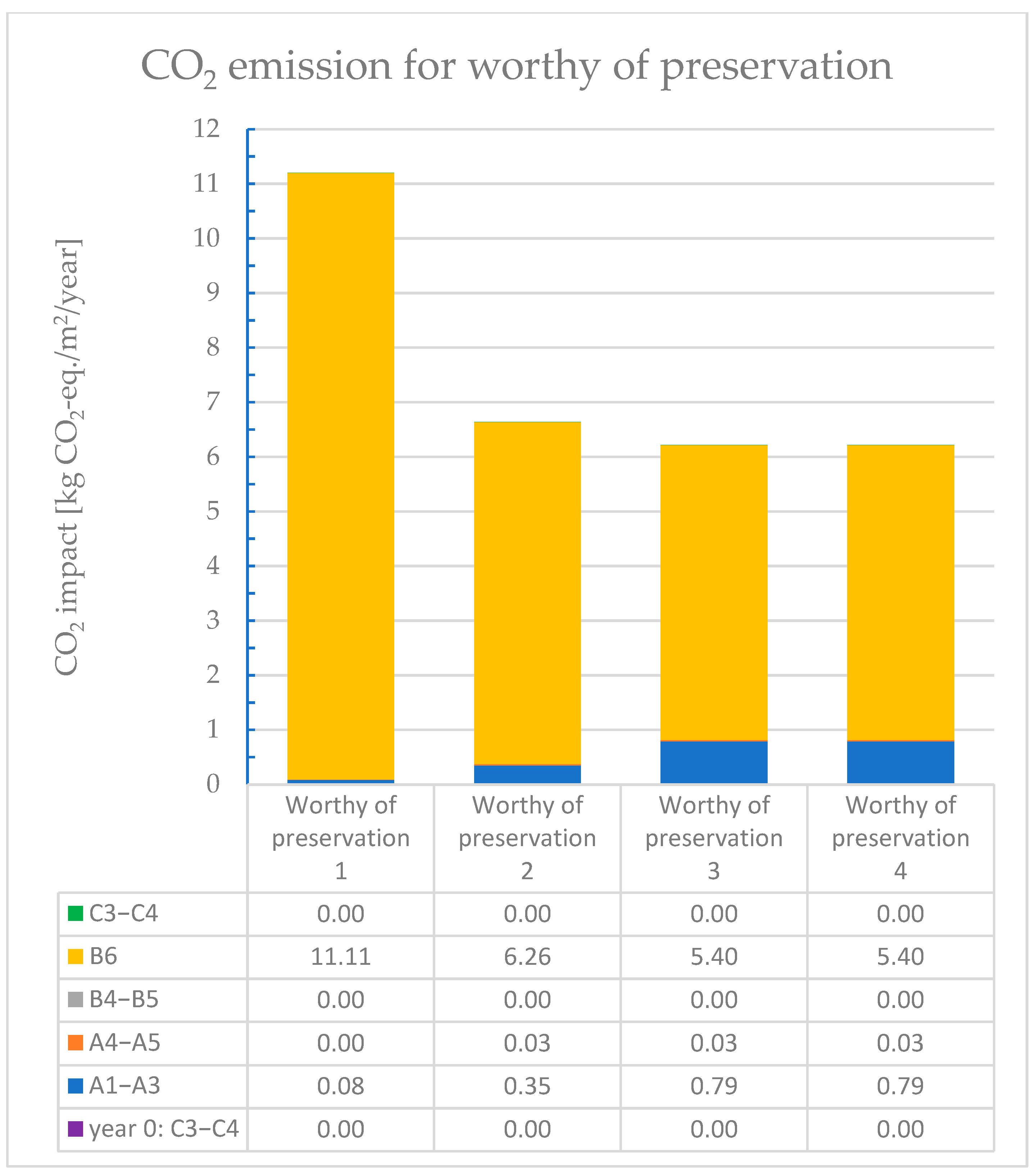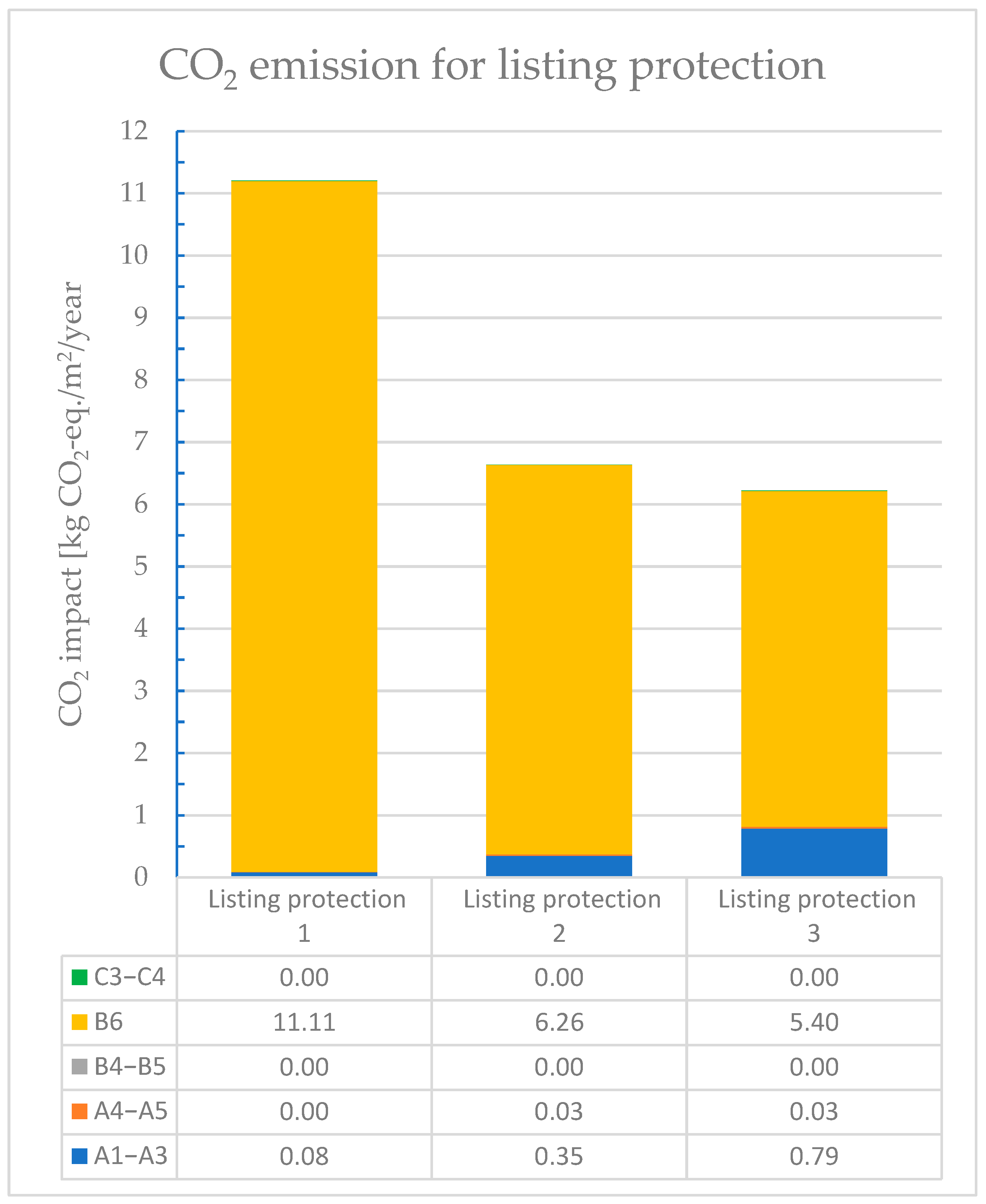 45], acknowledging the limited changes that can be made to the buildings due to their protected status based on cultural heritage and historic importance. The study indicates that this exemption could also be extended to cover a potential future LCA requirement for building renovations, as renovating buildings worthy of preservation or listed as protected is already a complex action due to the limitations on changes allowed to the building.