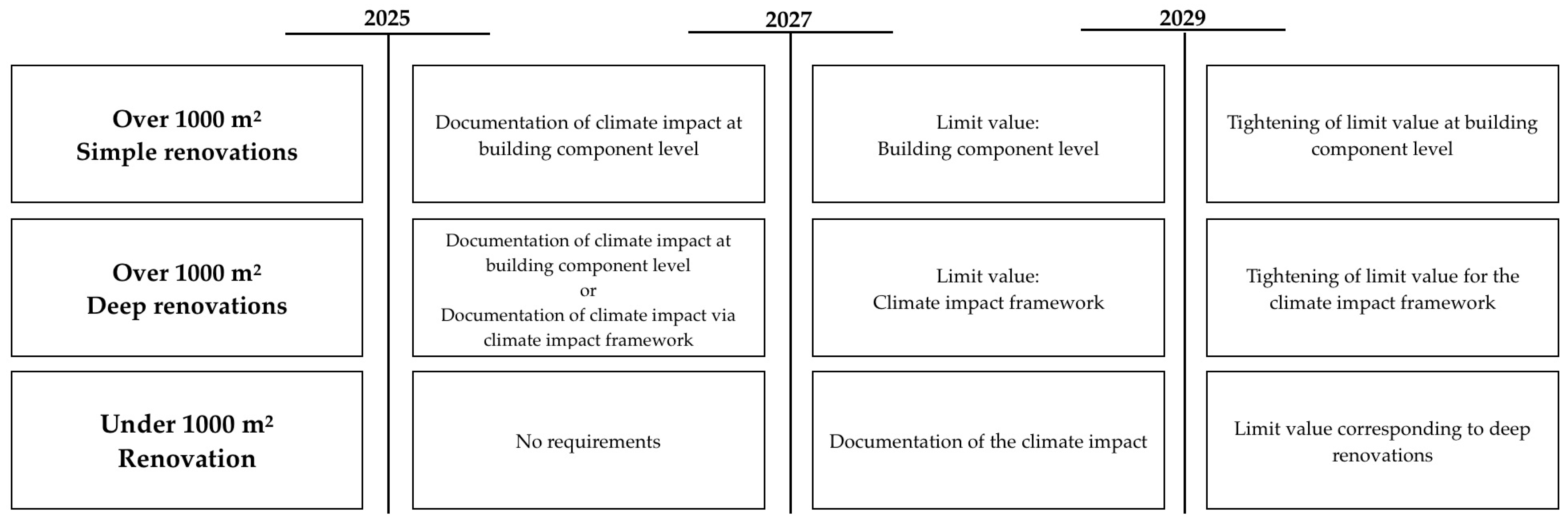 Challenges remain in comparing projects and establishing climate-related requirements due to methodological inconsistencies. As the analysis is based on a single renovation case, the findings may not be fully generalizable across the diverse range of renovation practices in Denmark. Broader case studies are needed to validate the proposed LCA methodologies and ensure their applicability to varying building types and intervention levels. Moreover, future assessments could incorporate additional LCA modules, such as transportation and D modules, which were excluded here to maintain alignment with Danish regulations. Future work should explore LCA applications in additional renovation cases and further investigate climate requirement benchmarks, as well as the social and economic factors influencing renovation decisions.