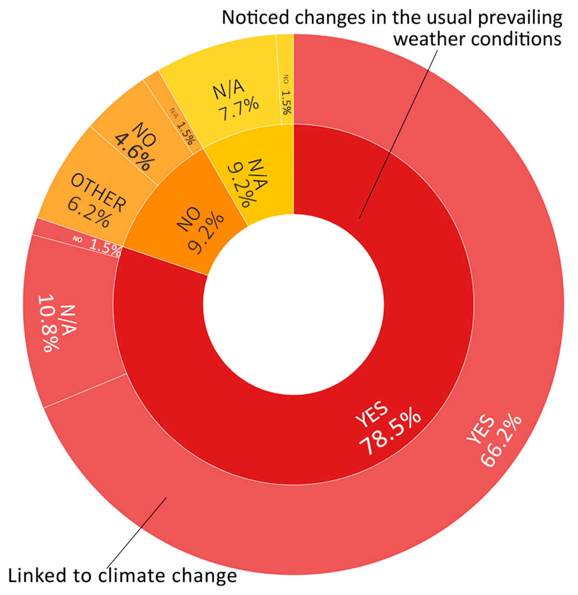 Based on participants’ responses regarding changes in weather conditions and the climate, the survey revealed that the majority (78.5%) acknowledged significant shifts in the climate (