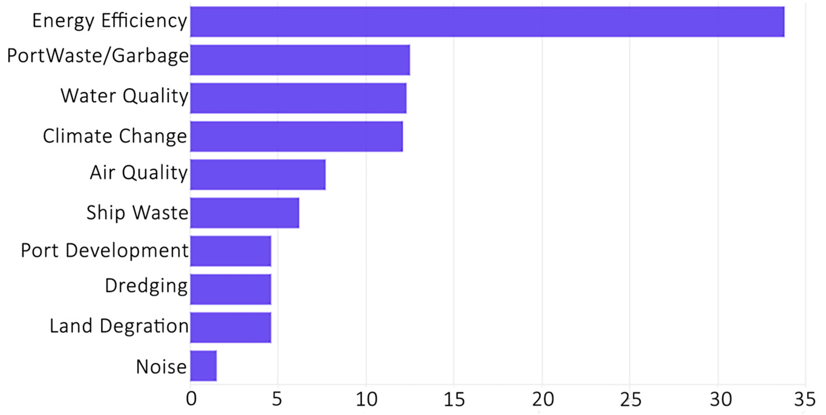 Through the consolidated analysis, it is noteworthy that, although climate change is acknowledged as a serious threat, its prioritization as an environmental concern remains relatively low, ranking fourth overall, in contrast with the higher emphasis seen in European contexts where climate change has been the port sector’s foremost environmental priority since 2022 [