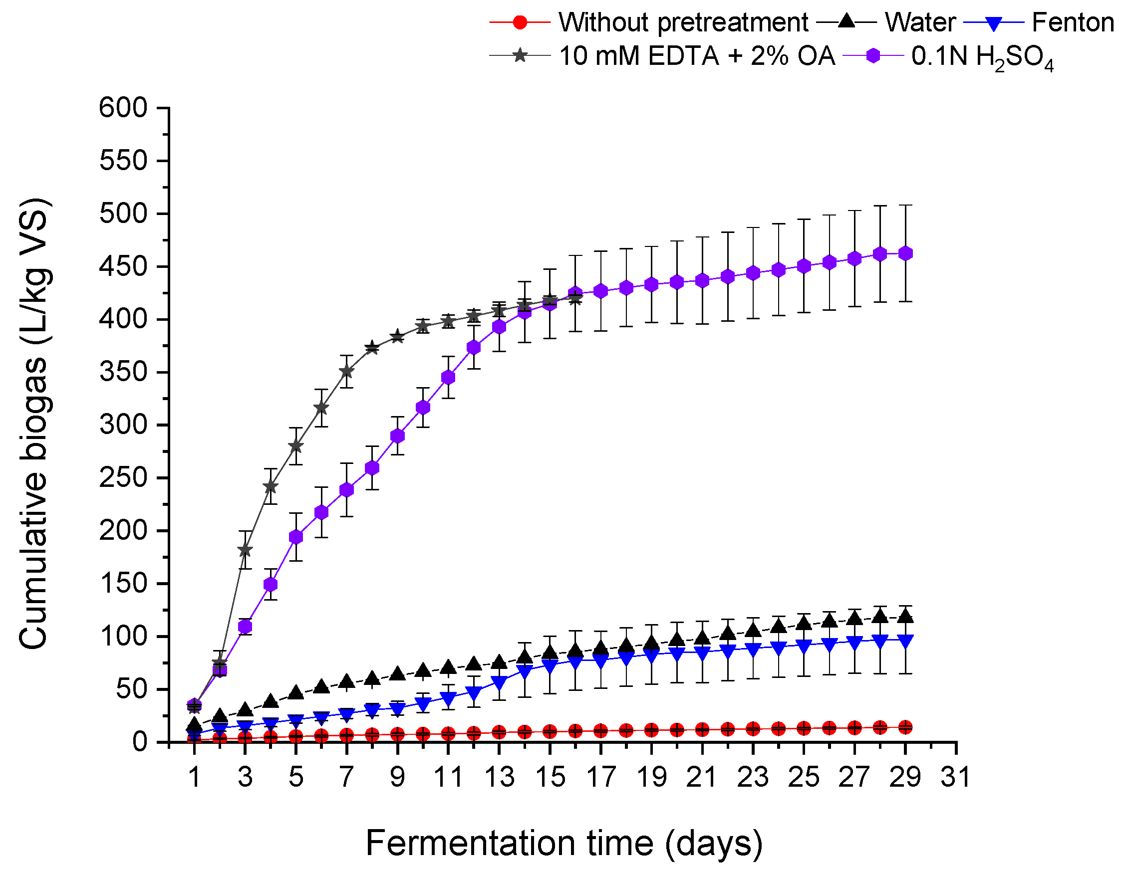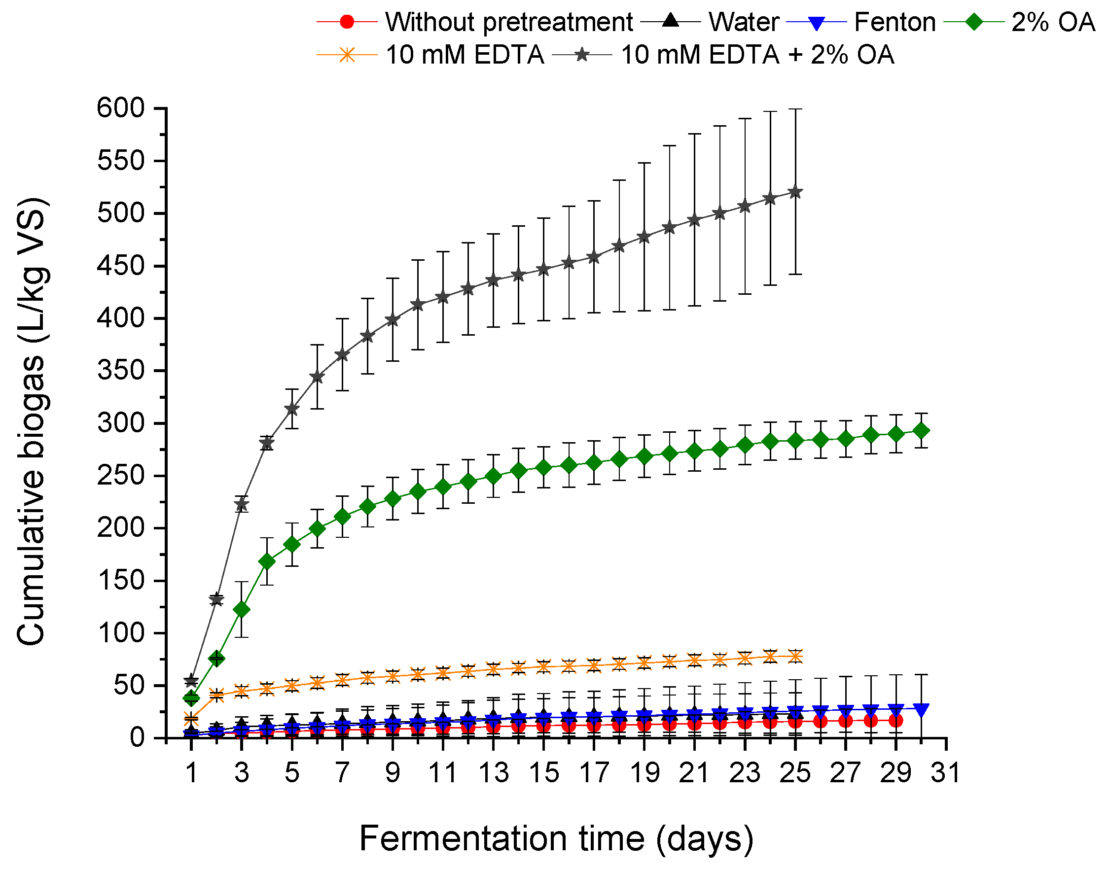 The remaining chemical treatment methods (Fenton, SS, and EDTA + OA) also significantly increased cumulative biogas production. The average amount of biogas for these three pretreatments was approximately 390 L/kg VS, which confirms the improved biodegradability of WG shavings after chemical modification. In