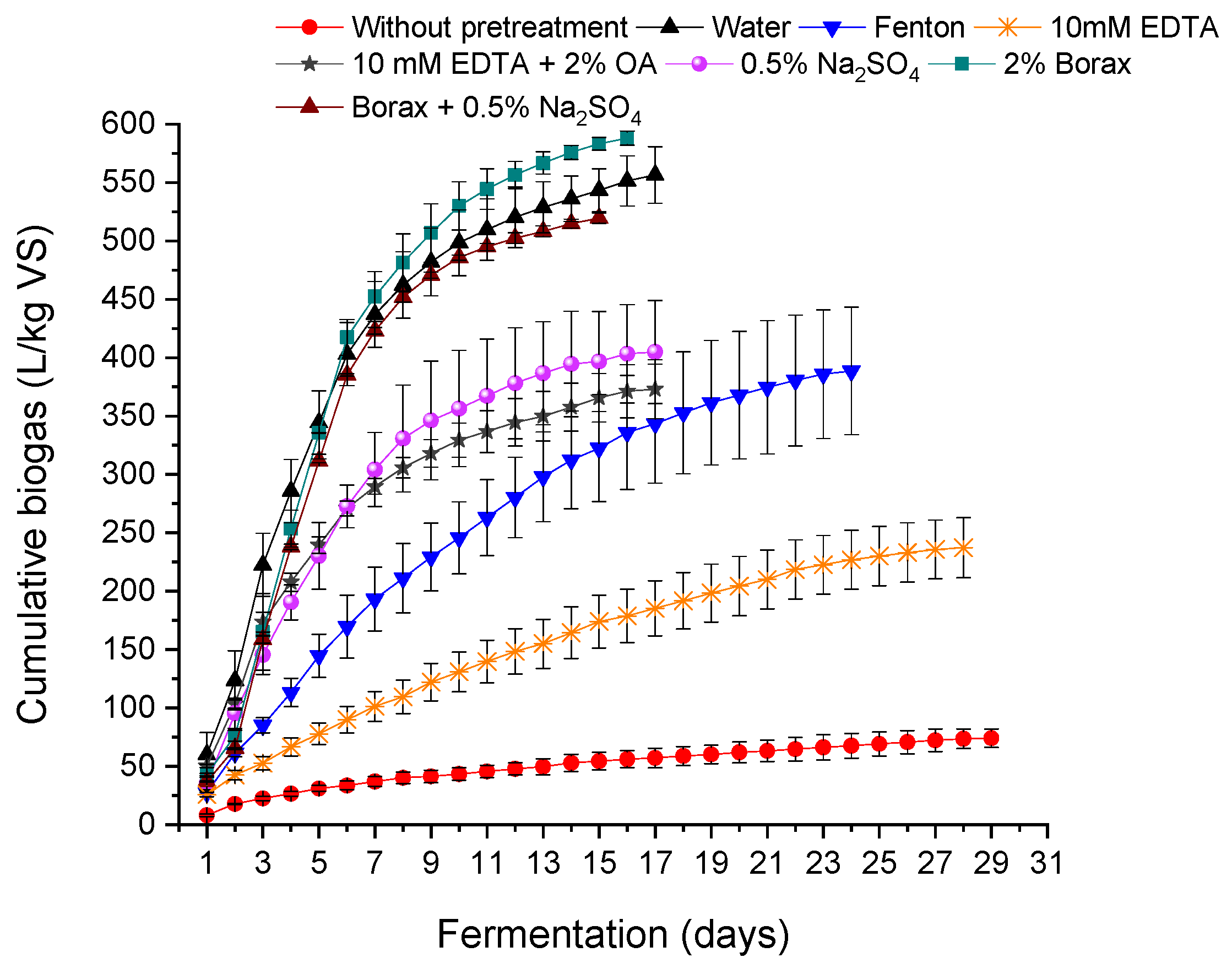 Figure 3, it can also be observed that the biogas curves for Fenton and EDTA pretreatment are flattened compared to the other methods, indicating a depletion of available substrate or other limiting factors. Application of strong oxidizing agents (e.g., in Fenton) and chelating compounds (e.g., EDTA) may lead to the formation of toxic byproducts, such as aromatic aldehydes, quinones, or complexed heavy metals (e.g., Cr-EDTA complexes), which can disrupt microbial metabolism—particularly methanogenesis. These substances, along with residual oxidants (e.g., H