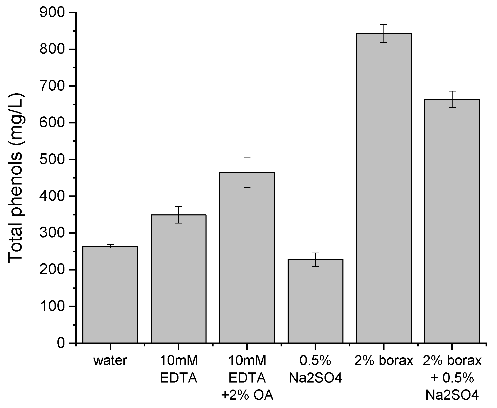 At the same time, the highest concentration of total phenols was found for the mixture of borax and water (843 mg/L,