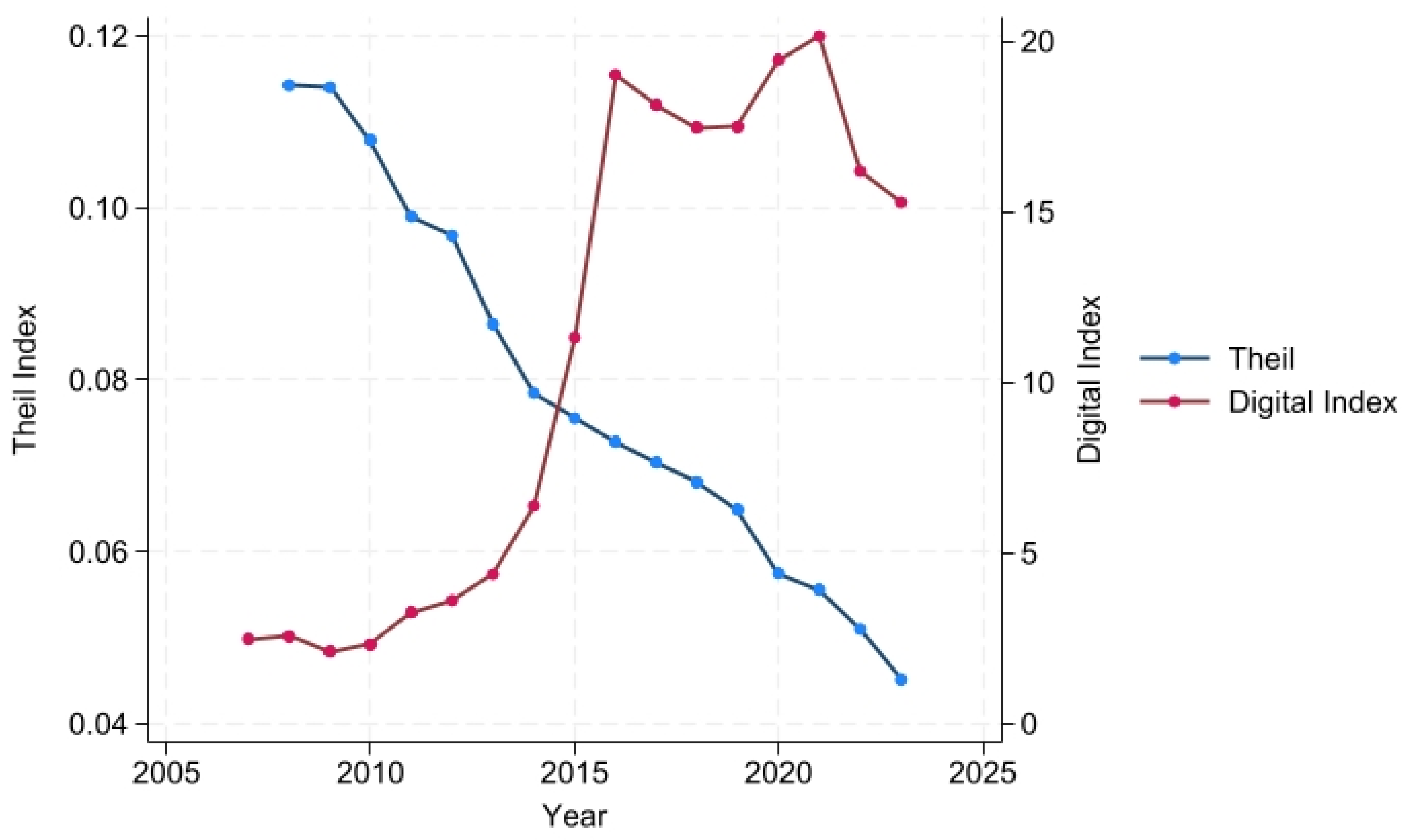 Figure 1 illustrates the long-run evolution of China’s urban–rural income inequality and digital infrastructure development between 2007 and 2023. The Theil index steadily declined from 0.118 in 2007 to 0.045 in 2023, whereas the digital infrastructure index, constructed from more than 5000 official local government work reports, rose sharply, particularly following major national initiatives such as the Broadband China Strategy (2013) and the “Internet+” Action Plan (2015). This mirror-shaped pattern suggests that, despite an observable narrowing in headline income ratios, the rapid expansion of digital infrastructure may be reshaping more profound structural inequalities. Whether digitalization mitigates or reinforces these underlying disparities at the city level remains empirically unresolved.