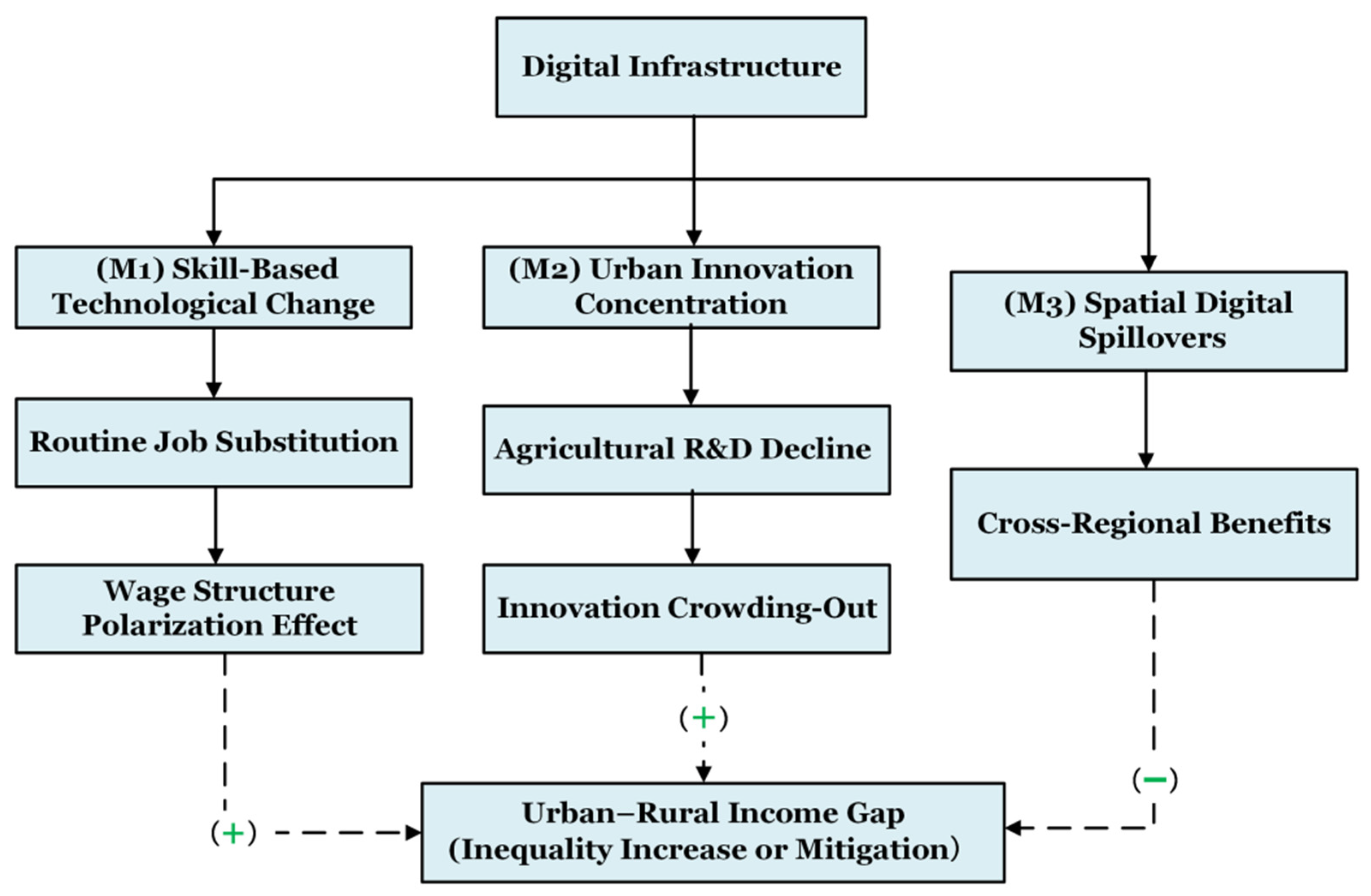 Building on the gaps identified earlier, this section explores the theoretical mechanisms through which digital infrastructure influences the urban–rural income gap. While the literature offers fragmented insights, a unified theoretical framework remains lacking. Accordingly, this section synthesizes the core mechanisms into three pathways: direct productivity effects, indirect structural effects, and spatial spillovers, and derives the corresponding testable hypotheses.
