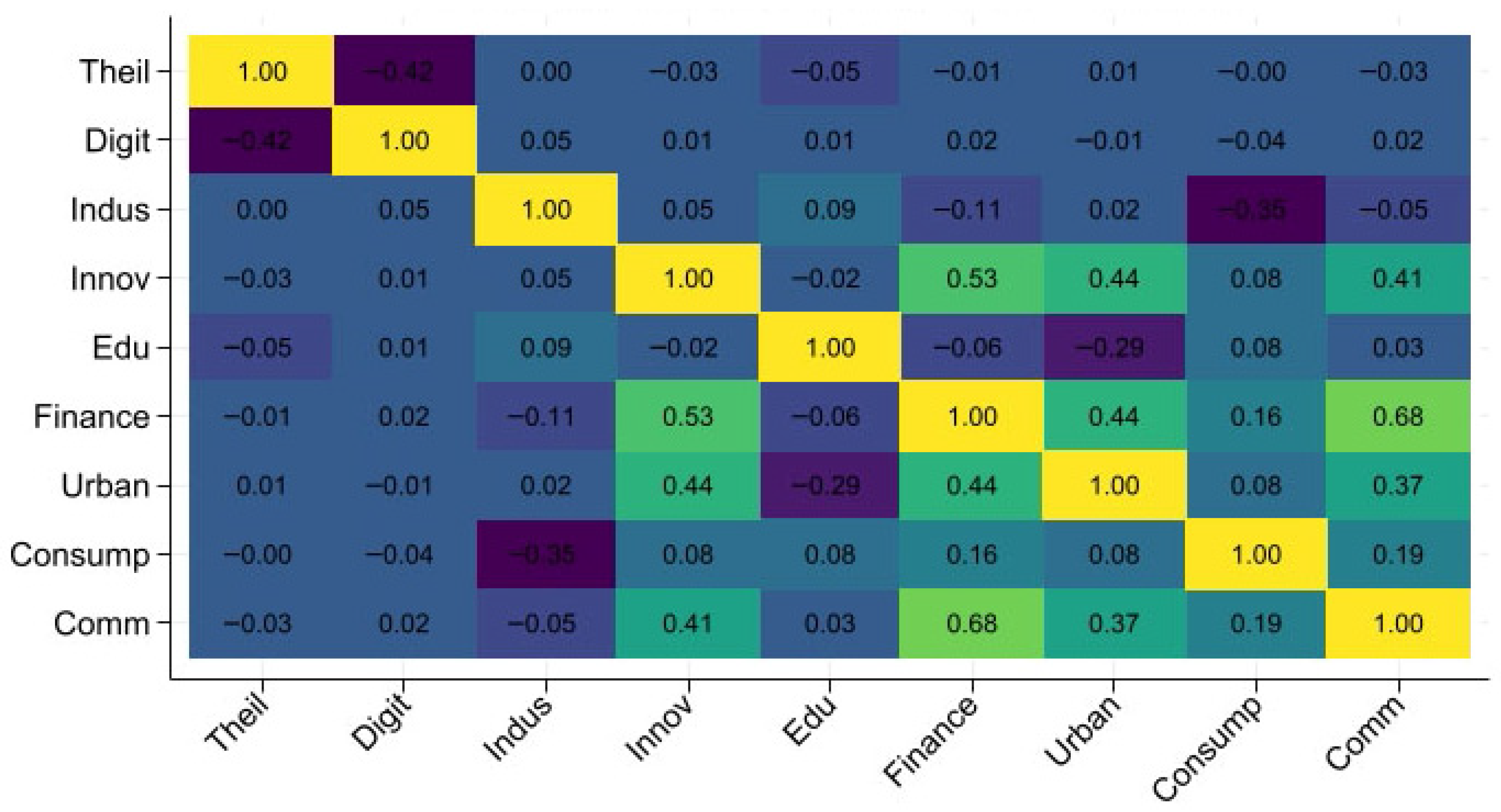 Figure 3 plots the heatmap of pairwise correlations. Theil and Digit show a negative correlation (r = –0.42), suggesting that higher levels of digital infrastructure are generally associated with narrower income gaps. All other coefficients are below 0.7, indicating that multicollinearity is not a serious concern. For additional robustness, the variance inflation factor (VIF) value is reported in