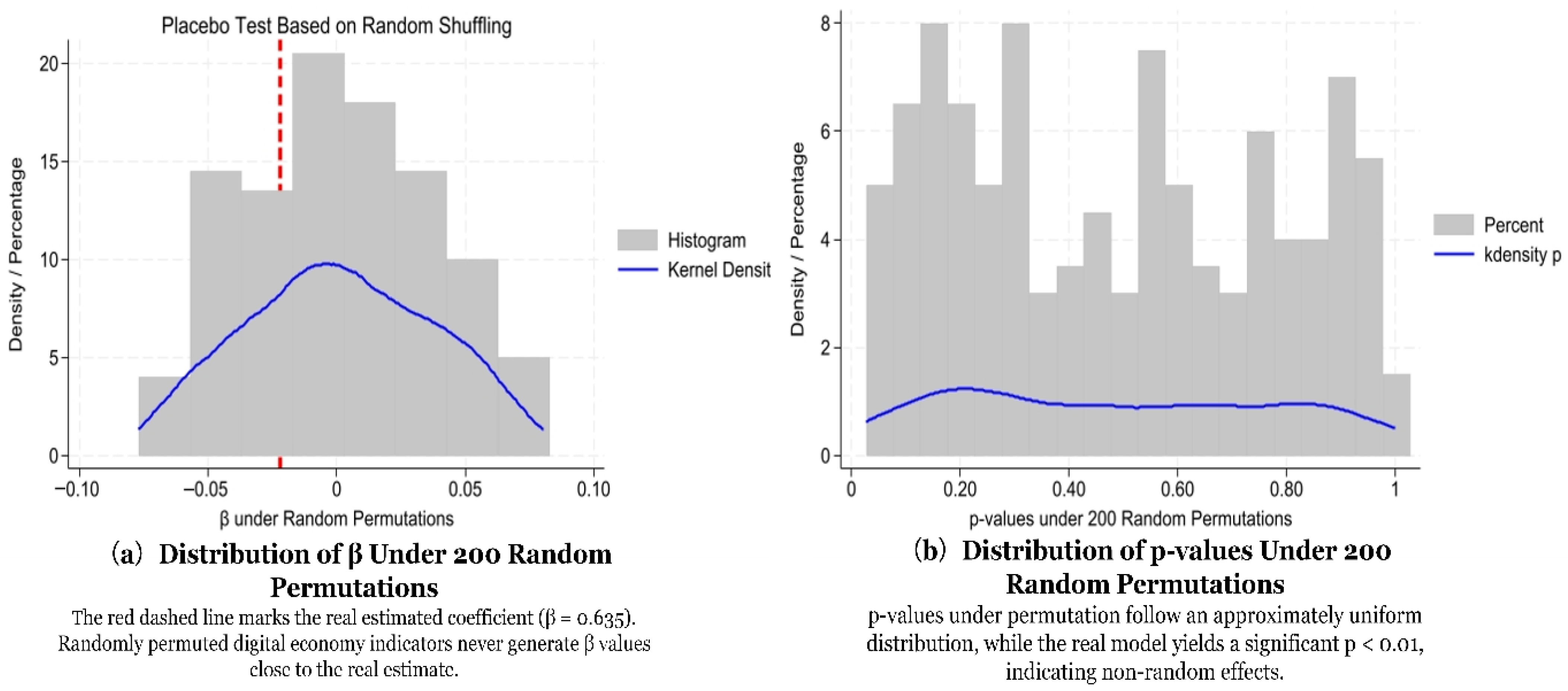 Thirdly, to address endogeneity, I conduct a permutation-based placebo test, randomly reassigning the digitalization variable 200 times to break any systematic link to inequality.