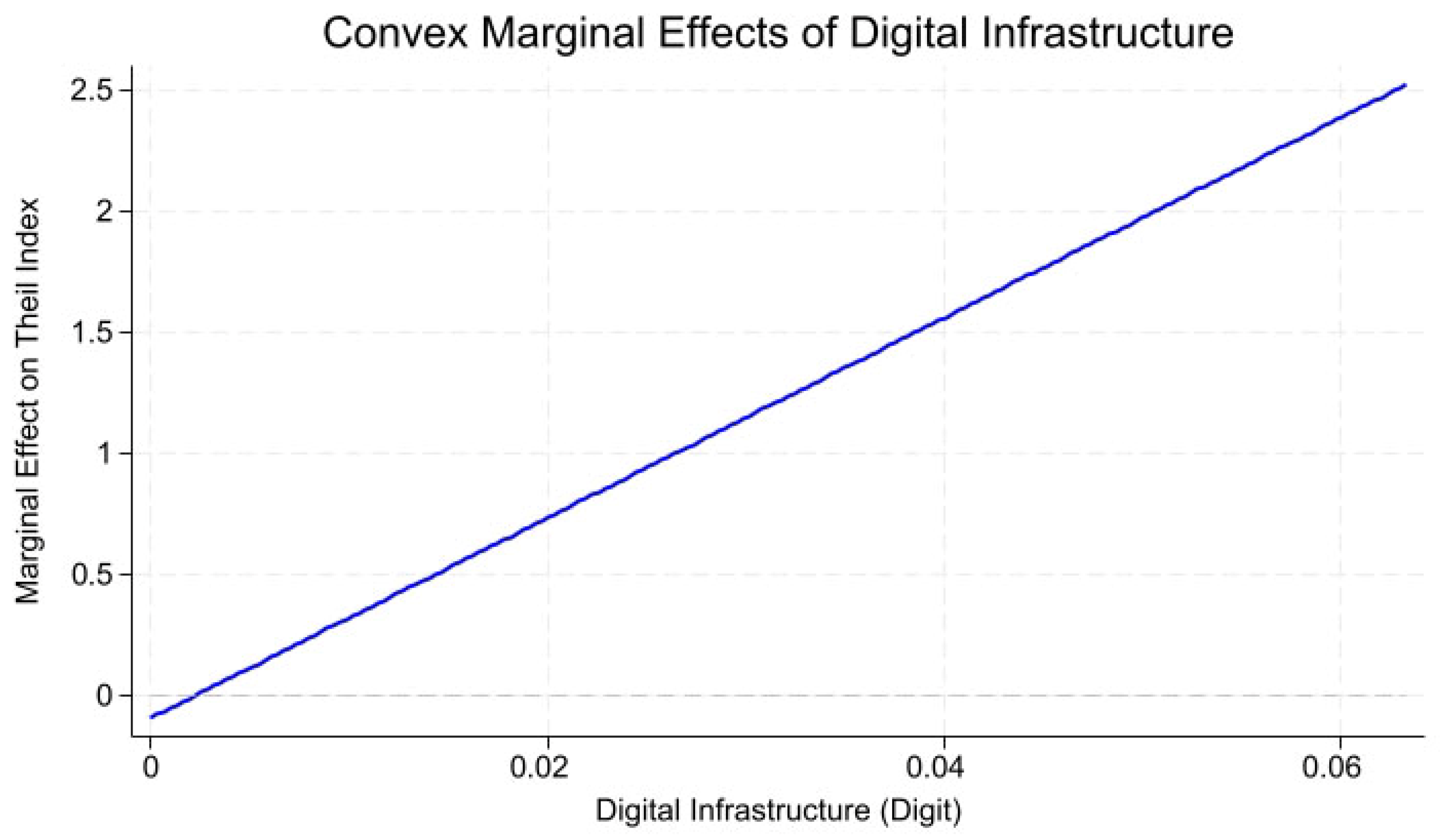 Figure 6, therefore, complements the formal statistical test by showing that digital infrastructure exerts increasingly stronger marginal effects on inequality as its level rises, despite the absence of a meaningful turning point within the economically relevant range.
