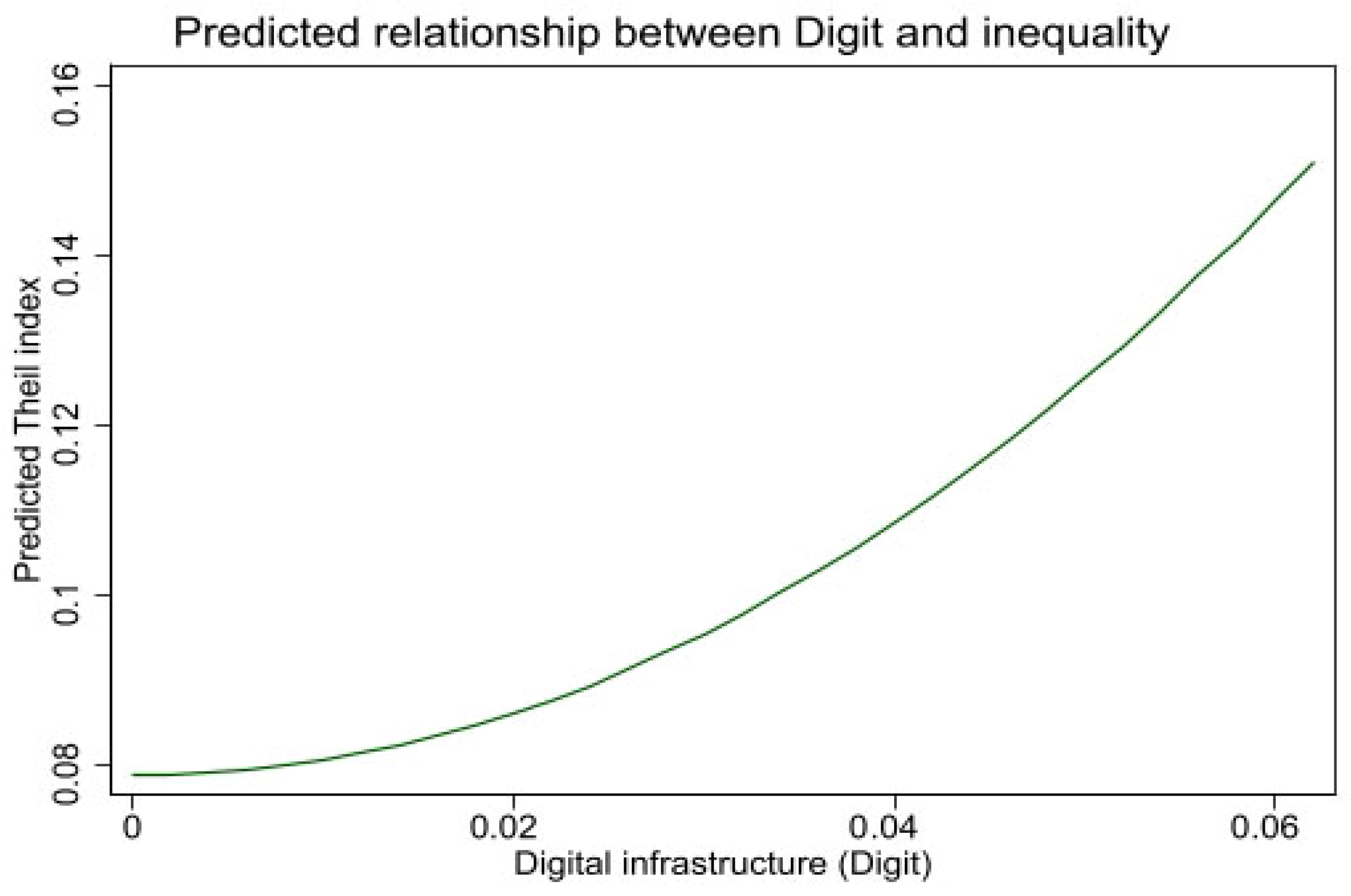 15]. Thus, the introduction of digital infrastructure may exacerbate spatial inequalities by disproportionately benefiting urban economies, leaving rural regions behind. Moreover, the productivity effects of digital infrastructure may be nonlinear. In the early stages, digital expansion may generate modest gains in both the urban and rural sectors. As digital development advances, however, its complementarities with skilled labor, innovation capacity, and institutional readiness grow stronger, indicating a potentially convex relationship between digitalization and inequality. This possibility justifies the nonlinear model tested in the empirical analysis.