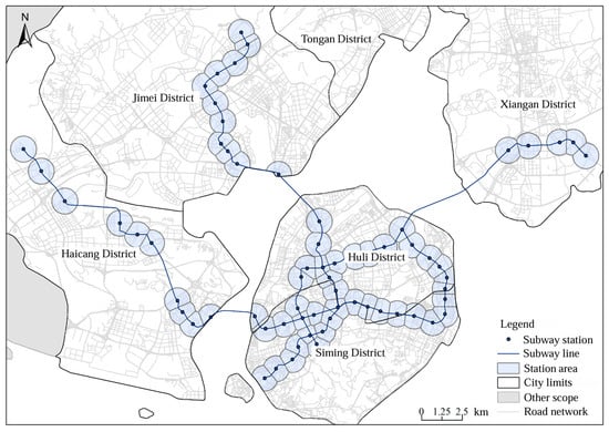 This study focuses on Xiamen City, which operates three urban rail transit lines comprising 66 stations as of June 2023. According to the Standards for the Planning of Urban Integrated Transport Systems (GH/T51328-2018 [49]), the service radius of a rail transit station is set at 800 m [50]. To delineate the area of influence for each station (hereinafter referred to as “station areas”) while ensuring non-overlapping boundaries consistent with station-level AFC data, the Thiessen polygon method, widely used in geographical and meteorological analysis, was employed. Although this method is relatively simple, it provides a reasonable approximation of station service areas when high-resolution individual travel path data are unavailable. We acknowledge that the choice of spatial delineation may influence subsequent calculations of built environment (BE) indicators. Sensitivity analysis using more precise network-based buffers will be considered in future research when detailed travel data become accessible.
