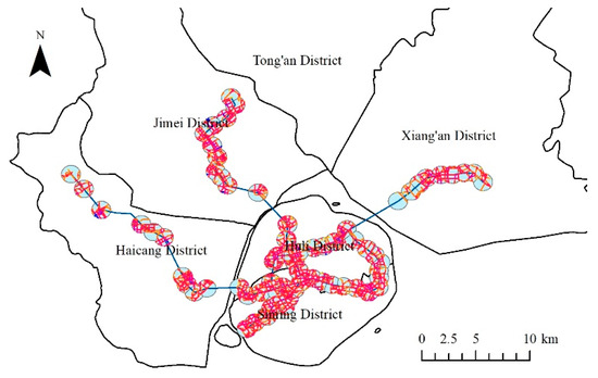 Spatial syntax—a method created by British Professor Bill Hillier for analyzing urban fine-scale spatial morphology and structure is adopted for calculating accessibility and walkability indicators. Its greatest advantage lies in treating urban transportation as an integrated system where changes in any local space affect other local spaces and even the city’s overall structure. Compared to other accessibility measurement methods, spatial syntax is suitable for accessibility quantification in urban rail transit lines, intra-urban blocks, and building interiors. Presently, numerous scholars have applied spatial syntax to evaluate various urban rail transit lines, validating its unique advantages in rail transit spatial accessibility research [50,52]. However, these studies predominantly use traditional axial line segmentation to describe rail transit distribution patterns, i.e., dividing each metro line into minimal connection units to study station accessibility. This method only considers accessibility of origin and transfer stations while ignoring spatial variation effects of accessibility between various line stations, often leading to imprecise evaluation results. Figure 4. illustrates the connectivity diagram generated using traditional axial segmentation for areas around Xiamen Metro; this process does not account for transfer frequency or the number of intermediate stations.