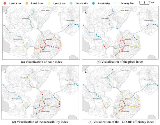 (2) When stations are classified based on TOD–ridership synergy, there is a noticeable decline in both TOD performance and passenger volume across the top four station levels as one moves outward from the city center, aligning with trends seen in other major cities. However, Level 5 stations, which are mainly situated in scenic or upscale residential areas, show relatively low ridership despite their central locations. This pattern highlights Xiamen’s unique spatial characteristics and underscores the importance of context-sensitive planning strategies to enhance service provision and development potential in these areas.
