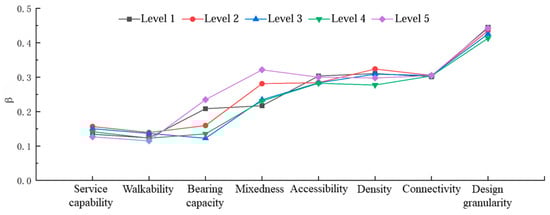 Comparison of β values across station levels (Figure 10) indicates that the design granularity factor exerts the strongest influence on passenger flow among all examined variables. The overall ranking of influence is as follows: Design granularity > Connectivity > Density > Accessibility > Mixedness > Bearing Capacity > Service Capability > Walkability. The significant association between “design granularity” (such as building and public facility density) and ridership is supported by established urban design theory. Finer-grained, compact development enhances transit patronage through three interlinked mechanisms: by shortening walkable distances and improving station accessibility, by concentrating trip origins and destinations within the catchment area, and by creating pedestrian-oriented street environments that incentivize transit use. This aligns with prior empirical findings on the role of compact, mixed-use form in driving rail patronage [54,55]. The robustness of this relationship in our analysis underscores design granularity as a critical, actionable dimension for TOD planning.