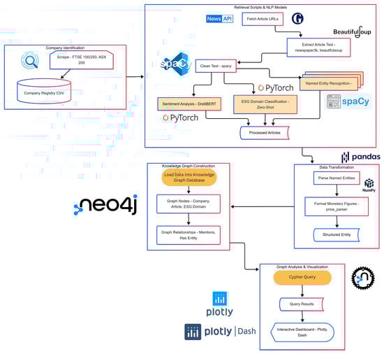 The framework within this study employs a data-driven pipeline architecture, as illustrated in Figure 1, that leverages AI techniques, primarily NLP, to automate the collection, analysis, and structuring of ESG-related news content for companies in the FTSE 100, FTSE 250, and ASX 200 indices.