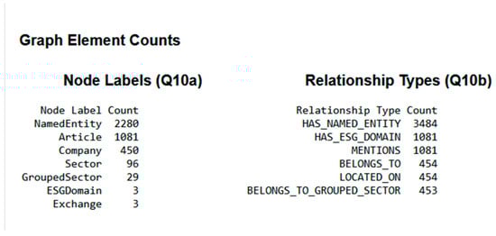 The relationship schema, detailed in Table 6, connects nodes (from Table 5) using relationships like MENTIONS, HAS_ESG_DOMAIN, LOCATED_ON, and BELONGS_TO, creating a rich, queryable ESG information network using Cypher. These specific properties were chosen to meet core ESG inferential analysis requirements. For instance, linking an “Article” to a “Company” via “Mentions,” and to an “ESG Domain” with a sentiment score, enables queries about how companies are portrayed regarding specific ESG themes and sentiment. Relationships such as “Belongs To” and “Located On” allow for comparative analyses, like examining sentiment trends or ESG focus across industries or markets. This relational structure turns isolated data into an interconnected network, aiding pattern discovery and deeper insights.