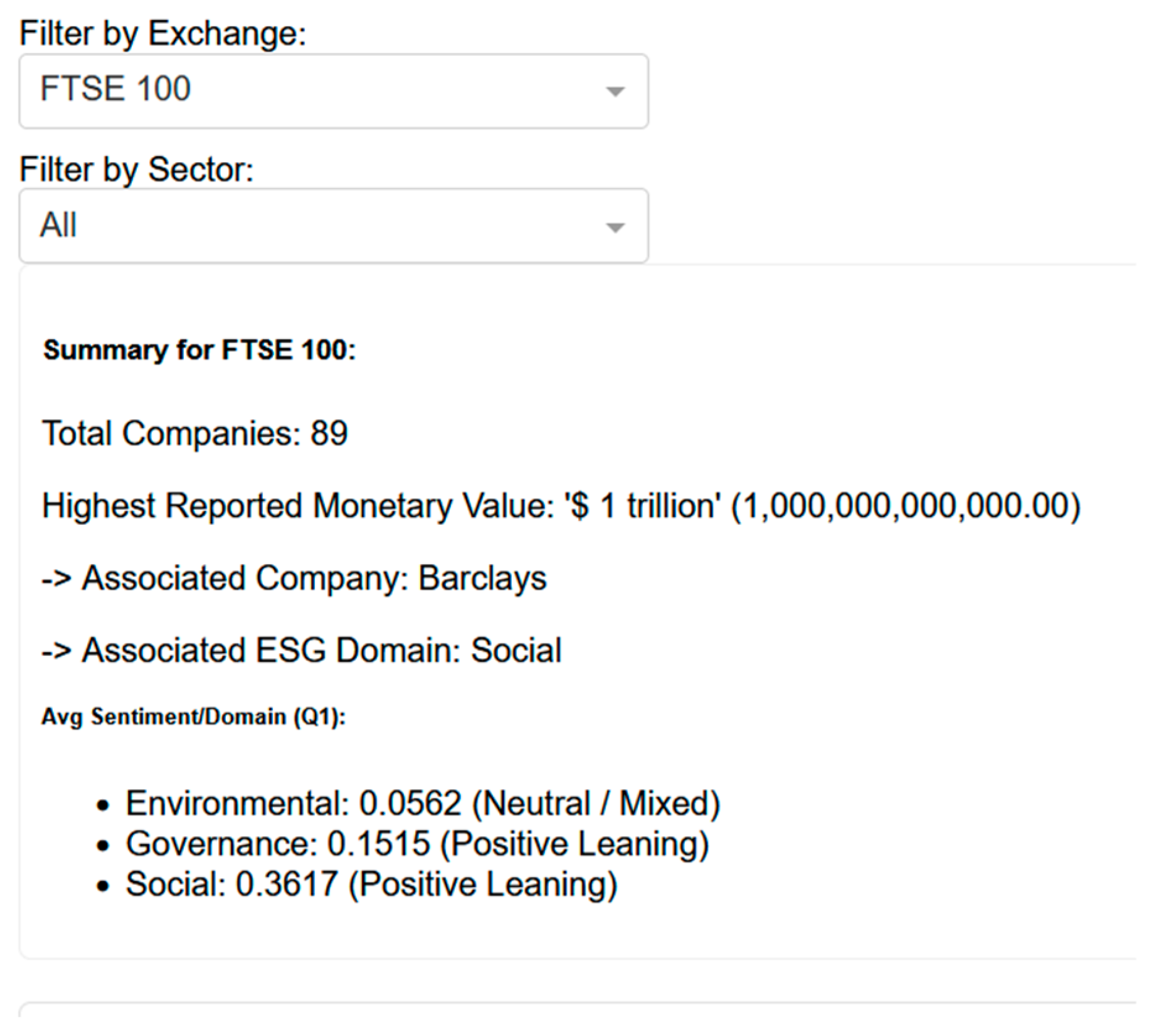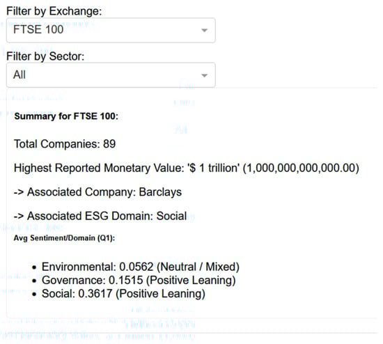 An interactive dashboard for visualising and exploring the KG, enabling stakeholders to identify sentiment trends, ESG focus areas of market directionalities, and relational dynamics across different companies and sectors within the FTSE 100, FTSE 250, and ASX 200 indices.