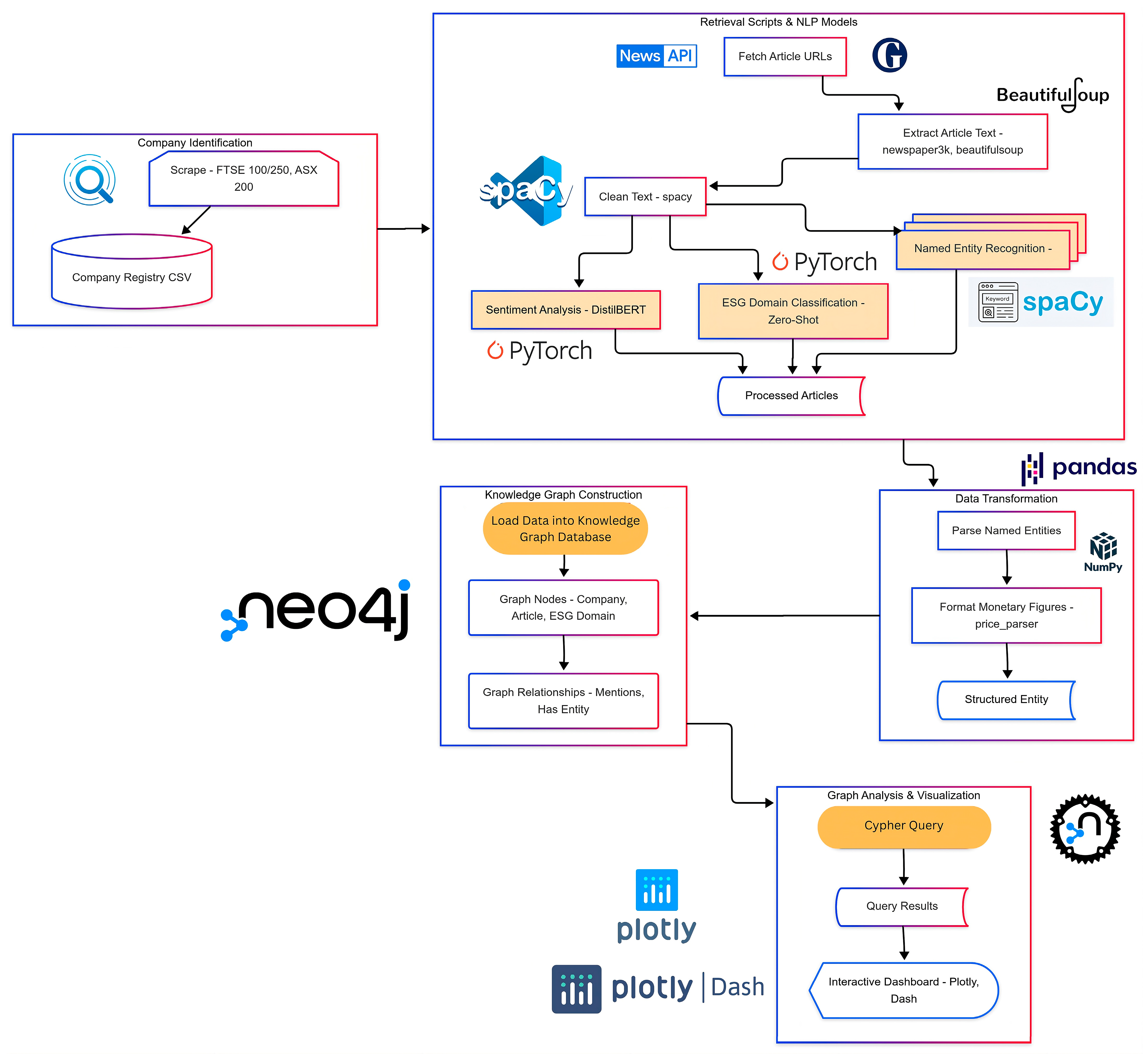 The framework processes news articles about firms from the FTSE 100, FTSE 250, and ASX 200 indices. These indices were chosen for their significant economic impact, broad sector representation, geographic diversity (UK and Australia), enabling comparative analysis, and their established importance in ESG reporting literature. This selection created a solid basis for showcasing the framework’s abilities across various market characteristics and regulatory settings, with potential future work to include other global indices. It then applies a series of NLP tasks: sentiment analysis using DistilBERT (distilbert-base-uncased-finetuned-sst-2-english) [3], to classify the tone of articles (Positive, Neutral, Negative) and Named Entity Recognition (NER) to identify key entities like organisations, people, locations, and monetary values; and topic modelling (ESG domain classification) using a hybrid approach of Bag-of-Words and Zero-Shot Classification [4], to map article relevance to Environmental, Social, or Governance domains. The core contribution lies in constructing a knowledge graph [5] that semantically links these extracted entities and insights, transforming ESG news data from a linear format into a richly connected knowledge space that is ideal for pattern detection and relational analytics. This approach moves beyond isolated metrics to reveal underlying connections and dynamics within ESG narratives. Also, Shahrour [6] proves that higher CSR/ESR engagement is associated with lower market-implied default risk firms, which connects ESG activity to a financial material risk channel