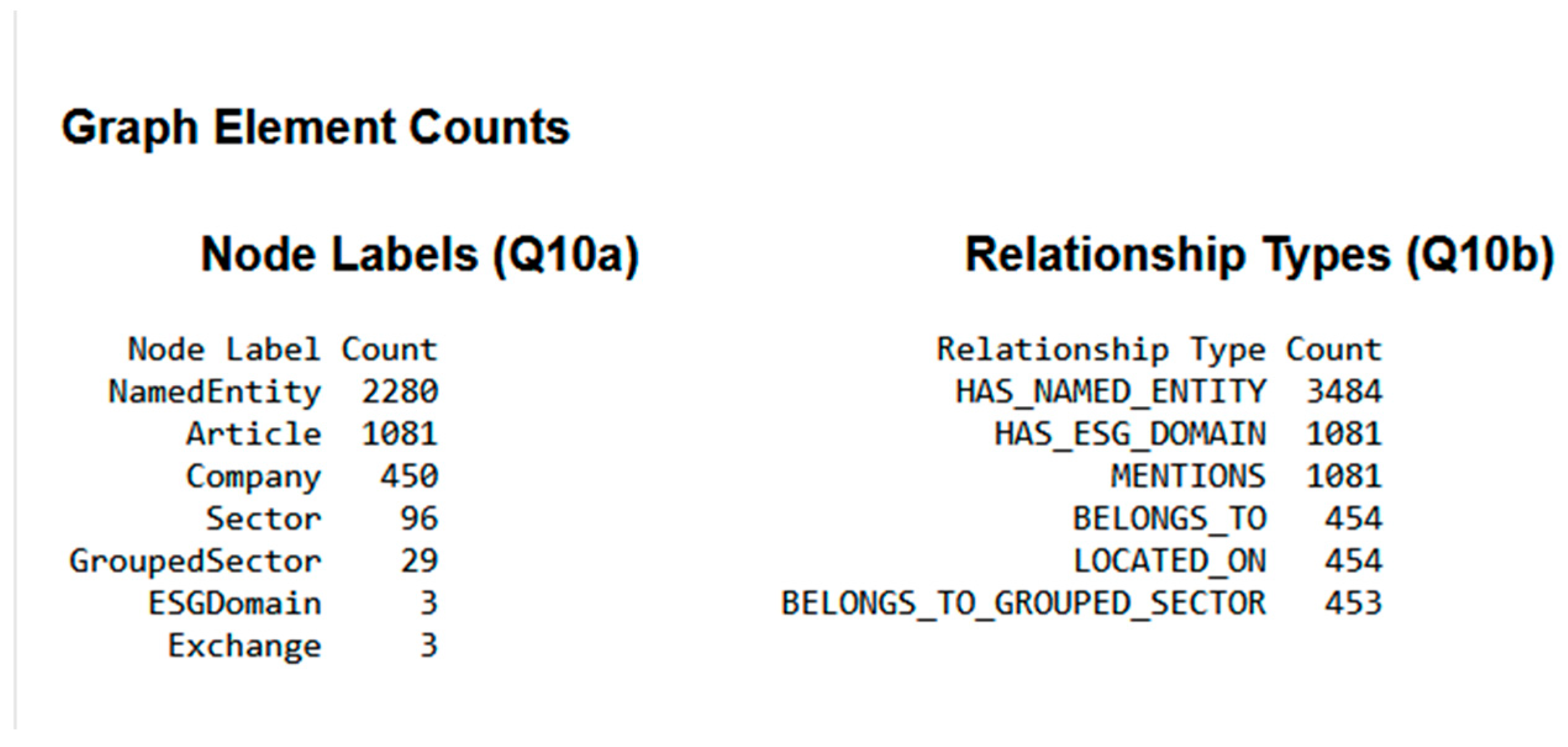 The structured outputs from the NLP phase were used to construct a property knowledge graph using Neo4j. Nodes were defined for entities like Company, Article, ESG Domain, Named Entity, Exchange, Sector, and Grouped Sector, with attributes storing relevant information (e.g., ticker, sentiment score). The node schema is detailed in Table 5, shown below.