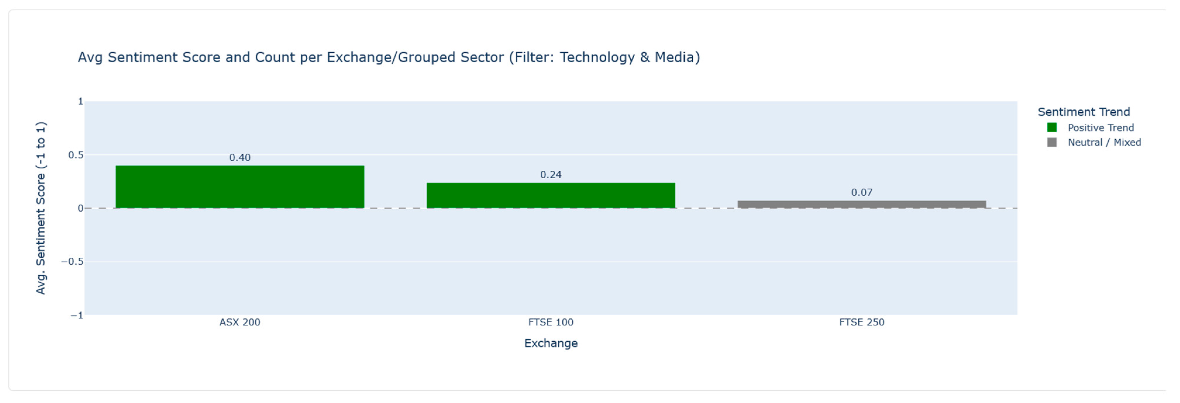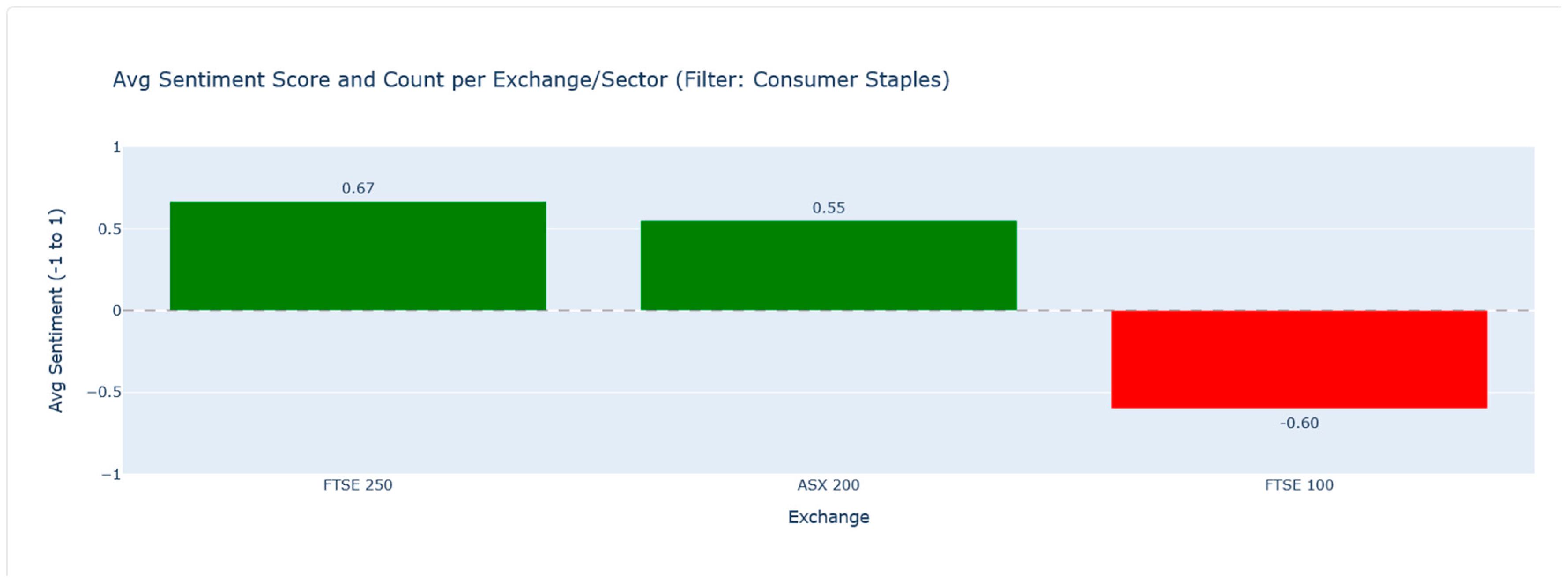 The DistilBERT model was used to assign a polarity score to each article. For individual articles, sentiment was then broadly categorised as ‘POSITIVE’, ‘NEGATIVE’, or ‘NEUTRAL’. In aggregated analyses presented in this study, such as the average sentiment per exchange, specific thresholds were applied to the average scores; an average sentiment score greater than 0.1 was classified as ‘Positive Leaning,’ a score less than −0.1 as ‘Negative Leaning,’ and scores between −0.1 and 0.1 (inclusive) as ‘Neutral/Mixed’. These specific thresholds were chosen pragmatically for this study to provide a precise tripartite classification based on the observed distribution of sentiment scores from the DistilBERT model on the initial dataset, allowing for differentiation beyond a simple zero-crossing. While not benchmarked against external studies for these specific values, they served to operationalise sentiment trends for comparative analysis within this framework. Future work could involve sensitivity analysis or calibration against manually labelled datasets to refine these thresholds.