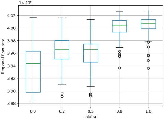 Previously, based on Table 3, it was determined that some pairs of strategies do not produce significant differences in outcomes at the regional level. These include the pairs 0.0 and 0.5, 0.2 and 0.5, and 0.8 and 1. These strategies can be included in the set of communication strategies that ensure evolutionary stability. When reapplying the Kruskal–Wallis test to this subset, it was found that no significant differences exist within the group of strategies 0.8 and 1. Thus, to ensure evolutionary stability, it is advisable to retain the strategies from this group by introducing appropriate constraints on oilfield production plans. Accordingly, in the following steps, it is assumed that each agent in the system either uses a single fixed value of the altruism coefficient or selects a value from the set of 0.8 and 1. As shown in Figure 2, higher altruism coefficients are preferred at the regional level.