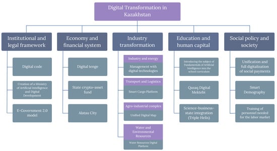 Figure 4 shows the main directions of digital transformation in Kazakhstan. This direction is based on the transition of the country to the AI, data, and platform model.