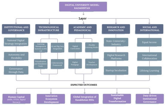In conclusion, the proposed model combines five sustainable structural components of digital transformation based on a systematic analysis of the experience of ten countries: governance, technological infrastructure, academic innovation, research ecosystem and socio-international integration. These components are based on empirical models that are aligned with the institutional and political framework of Kazakhstan. The main results of the model are aimed at strengthening human capital, developing an innovative ecosystem, deepening global integration and ensuring long-term sustainability.