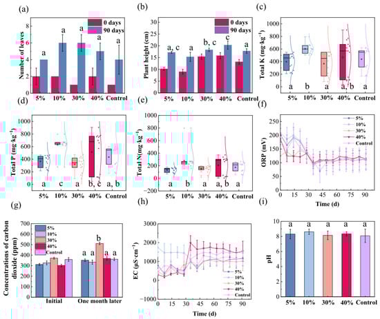 Effects of bentonite addition ratios on Kandelia obovata growth and coastal wetland substrate properties. (a) Leaf number; (b) Plant height (decrease reflects pruning of withered apices); (c) Total potassium; (d) Total phosphorus; (e) Total nitrogen; (f) Oxidation-reduction potential (ORP); (g) CO2 emission; (h) Electrical conductivity (EC); (i) pH. Different lowercase letters denote significant differences (p < 0.05, Duncan’s test).