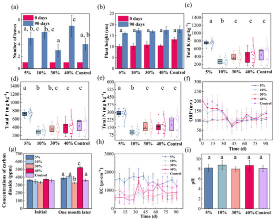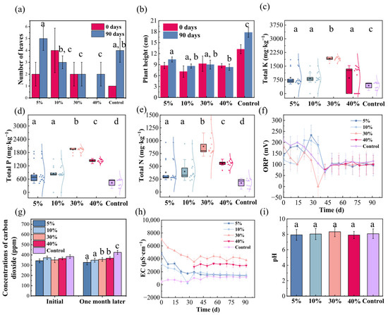 Effects of vermiculite addition ratios on Kandelia obovata growth and coastal wetland substrate properties. (a) Leaf number; (b) Plant height (decrease denotes pruning of withered apices); (c) Total potassium; (d) Total phosphorus; (e) Total nitrogen; (f) Oxidation-reduction potential (ORP); (g) CO2 emission; (h) Electrical conductivity (EC); (i) pH. Different lowercase letters denote significant differences (p < 0.05, Duncan’s test).