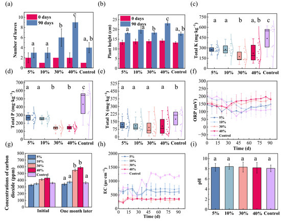 Effects of maifan stone addition ratios on Kandelia obovata growth and coastal wetland substrate properties. (a) Leaf number; (b) Plant height (decrease denotes pruning of withered apices); (c) Total potassium; (d) Total phosphorus; (e) Total nitrogen; (f) Oxidation-reduction potential (ORP); (g) CO2 emission; (h) Electrical conductivity (EC); (i) pH. Different lowercase letters denote significant differences (p < 0.05, Duncan’s test).