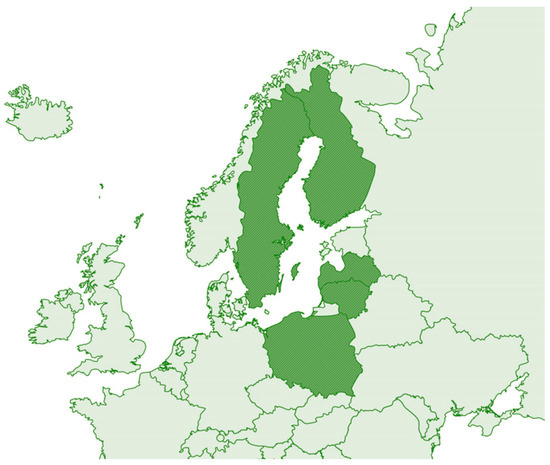 This study employs a comparative case study approach across five BSR countries—Sweden (SE), Finland (FI), Lithuania (LT), Latvia (LV), and Poland (PL)—chosen for their robust forest-based economies, shared environmental challenges, and varying levels of circular economy (CE) implementation to achieve this aim (Figure 1). The BSR, a geographically and culturally diverse region encircling the Baltic Sea, encompasses Denmark, Estonia, Finland, northern Germany, Latvia, Lithuania, Poland, Sweden, and occasionally the Kaliningrad region of Russia [29].