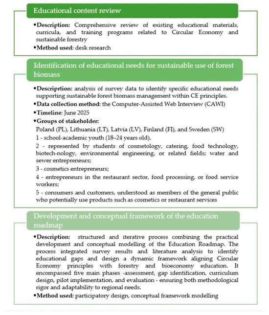 The development of the Education Roadmap followed a structured and data-driven methodology aimed at identifying educational priorities, gaps, and tools necessary for enhancing CE knowledge transfer within the forestry and bioeconomy sectors. This approach combines elements of desk research, conceptual modelling, and empirical analysis, integrating quantitative results from stakeholder surveys with qualitative assessments derived from expert opinions and existing educational materials. Desk research provides a theoretical and contextual basis by systematically reviewing the scientific literature, educational programmes, and institutional resources related to CE education in the forestry sector. The primary goal was to create a roadmap that aligns educational content with sectoral needs, ensuring effective dissemination of CE principles across formal and informal learning environments (Figure 3).