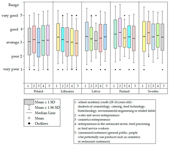 Polish respondents provided the most critical evaluations, with median scores around “average” (3) and wide dispersion, indicating considerable variation. Participants from FI and SE expressed more favorable opinions, with medians approaching “good” (4) and fewer negative outliers. LT and LV showed intermediate ratings from average to good, with narrower variability than PL. Among stakeholder categories, academic youth (Group 1) assessed opportunities as average, though more positively in Nordic countries. Entrepreneurs from water and sewage (Group 2) and food and gastronomy (Group 4) provided the lowest evaluations, between poor and average, suggesting misalignment with sectoral needs. Cosmetics entrepreneurs (Group 3) reported higher satisfaction, particularly in LT and FI, where median scores reached “good.” Consumers (Group 5) were the most optimistic, assessing opportunities as average or good. The results show that perceptions vary across geographical and professional dimensions. Nordic countries and consumer groups viewed educational offerings more favourably, while Polish stakeholders and sector-specific entrepreneurs expressed greater dissatisfaction, indicating gaps in relevant learning resources.