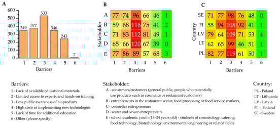 Figure 5A shows the distribution of barriers identified by respondents. The most significant obstacle was low public awareness of bioproducts (Barrier 3), reported by over 500 participants. This indicates that education challenges extend beyond lack of teaching materials, reflecting a broader systemic issue: insufficient societal understanding limits demand for educational content and motivation to develop it. Common barriers included limited access to experts and practical training (Barrier 2) and lack of educational materials (Barrier 1), indicating educational infrastructure weaknesses. High implementation costs (Barrier 4) and lack of time for learning (Barrier 5) were reported less frequently, suggesting main challenges relate to knowledge accessibility rather than financial or time constraints. Few open-ended responses (Barrier 6) confirmed the predefined categories captured key challenges.