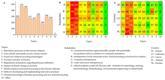 Priority topics for education on sustainable forest biomass use according to survey respondents (A) overall distribution, (B) stakeholder group comparison, (C) country-level comparison.