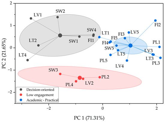 To enhance the comprehension of stakeholder diversity and ensure that the Education Framework is better aligned with specific user needs, a segmentation analysis was conducted using the survey dataset. The analysis included responses from five BRS countries—FI, SE LV, LT and PL-encompassing five principal stakeholder groups: (1) students and young academics (18–24 years); (2) entrepreneurs from the water and wastewater sector; (3) entrepreneurs from the cosmetics industry; (4) representatives of the food processing and gastronomy sector; and (5) consumers as potential end-users of bio-based products. The aggregated data were standardized using the z-score method (mean = 0, SD = 1) to ensure comparability across variables and countries. Stakeholder segmentation was subsequently performed using the K-means clustering algorithm (K = 3) implemented in Origin(Pro) (OriginLab, version 2025b). The number of clusters was determined based on theoretical assumptions reflecting three dominant engagement dimensions (Academic, Practical, and Decision) and verified through visual inspection of centroid distances [45]. This segmentation procedure provided a structured analytical foundation for distinguishing stakeholder profiles and tailoring the Education Framework to the specific characteristics and needs of different groups across the BRS.